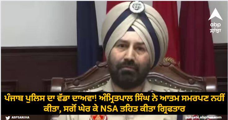 Amritpal Singh Arrested: ਪੰਜਾਬ ਪੁਲਿਸ ਨੇ 'ਵਾਰਿਸ ਪੰਜਾਬ ਦੇ' ਜਥੇਬੰਦੀ ਦੇ ਮੁਖੀ ਅੰਮ੍ਰਿਤਪਾਲ ਸਿੰਘ ਵੱਲੋਂ ਆਤਮ ਸਮਰਪਣ ਕਰਨ ਦੇ ਦਾਅਵਿਆਂ ਨੂੰ ਖਾਰਜ ਕੀਤਾ ਹੈ। ਪੁਲਿਸ ਨੇ ਕਿਹਾ ਕਿ ਅੰਮ੍ਰਿਤਪਾਲ ਸਿੰਘ ਐਨਐਸਏ ਤਹਿਤ ਗ੍ਰਿਫਤਾਰ ਕੀਤਾ ਹੈ। ਪੰਜਾਬ ਪੁਲਿਸ ਨੇ ਪ੍ਰੈੱਸ ਕਾਨਫਰੰਸ ਕਰਕ ਦਾਅਵਾ ਕੀਤਾ ਕਿ ਅੰਮ੍ਰਿਤਪਾਲ ਸਿੰਘ ਨੇ ਆਤਮ ਸਮਰਪਣ ਨਹੀਂ ਕੀਤਾ ਸਗੋਂ ਉਸ ਨੂੰ ਘੇਰ ਕੇ ਗ੍ਰਿਫਤਾਰ ਕੀਤਾ ਗਿਆ ਹੈ।