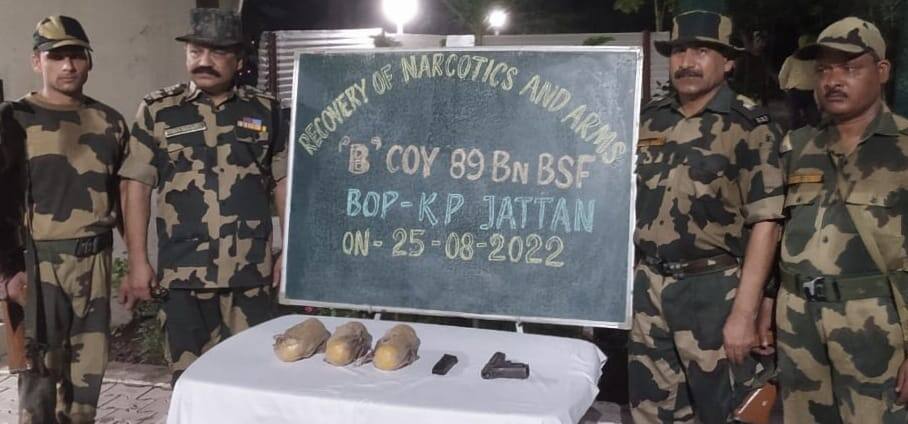 ਬੀ.ਐਸ.ਐਫ ਨੇ ਕੰਡਿਆਲੀ ਤਾਰ ਤੋਂ ਅੱਗੇ ਦੇ ਖੇਤਰ ਦੀ ਗਸ਼ਤ ਅਤੇ ਤਲਾਸ਼ੀ ਦੌਰਾਨ ਨਸ਼ੀਲੇ ਪਦਾਰਥਾਂ ਅਤੇ ਹਥਿਆਰਾਂ ਦੀ ਖੇਪ ਬਰਾਮਦ ਕੀਤੀ ਹੈ।ਪਾਰਟੀ ਦੀ ਅਗਵਾਈ ਜੈਪਾਲ ਸਿੰਘ ਕਰ ਰਹੇ ਸੀ।DC ਦੇ ਨਾਲ ਦੋ Sos ਅਤੇ 03 Ors ਸਮੇਤ 'G' ਪ੍ਰਤੀਨਿਧੀ ਵੀ ਸੀ।ਤਲਾਸ਼ੀ ਦੌਰਾਨ ਬੀਪੀ ਨੰਬਰ 29/09 ਤੋਂ 400 ਮੀਟਰ ਅੰਦਰੋਂ ਉੱਚੇ ਵਿਕਾਸ ਵਾਲੇ ਸਰਕੰਡਾ ਦੇ ਅੰਦਰ ਛੁਪਾਏ ਹੋਏ ਹਸਨ ਕੱਪੜੇ ਦੇ ਥੈਲੇ ਵਿੱਚ ਇਕ ਪੈਕੇਟ ਬਰਾਮਦ ਹੋਇਆ ਹੈ।