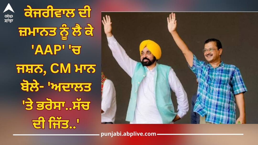 ਪੰਜਾਬ ਦੇ ਮੁੱਖ ਮੰਤਰੀ ਭਗਵੰਤ ਮਾਨ ਵੱਲੋਂ ਵੀ ਐਕਸ (ਪਹਿਲਾਂ ਟਵਿੱਟਰ) ਉੱਤੇ ਪੋਸਟ ਪਾ ਕੇ ਅਰਵਿੰਦ ਕੇਜਰੀਵਾਲ ਨੂੰ ਜ਼ਮਾਨਤ ਮਿਲਣ ਨੂੰ ਲੈ ਕੇ ਖੁਸ਼ੀ ਜ਼ਾਹਿਰ ਕਰਦੇ ਹੋਏ ਲਿਖਿਆ ਹੈ- 'ਅਦਾਲਤ ਵਿੱਚ ਭਰੋਸਾ ਰੱਖੋ..ਕੇਜਰੀਵਾਲ ਜੀ ਦੀ ਜ਼ਮਾਨਤ..ਸੱਚ ਦੀ ਜਿੱਤ..'