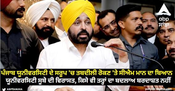 Punjab News : ਪੰਜਾਬ ਯੂਨੀਵਰਸਿਟੀ, ਚੰਡੀਗੜ੍ਹ ਦੇ ਸਰੂਪ ਵਿੱਚ ਕਿਸੇ ਵੀ ਤਰ੍ਹਾਂ ਦੀ ਤਬਦੀਲੀ ਰੋਕਣ ਲਈ ਸੂਬਾ ਸਰਕਾਰ ਦੀ ਦ੍ਰਿੜ ਵਚਨਬੱਧਤਾ ਨੂੰ ਦੁਹਰਾਉਂਦਿਆਂ ਮੁੱਖ ਮੰਤਰੀ ਭਗਵੰਤ ਮਾਨ ਨੇ ਅੱਜ ਕਿਹਾ, ਇਹ ਯੂਨੀਵਰਸਿਟੀ ਸੂਬੇ ਦੀ ਵਿਰਾਸਤ ਹੈ ਤੇ ਇਸ ਵਿੱਚ ਕਿਸੇ ਵੀ ਤਰ੍ਹਾਂ ਦਾ ਬਦਲਾਅ ਬਰਦਾਸ਼ਤ ਨਹੀਂ ਕੀਤਾ ਜਾਵੇਗਾ।