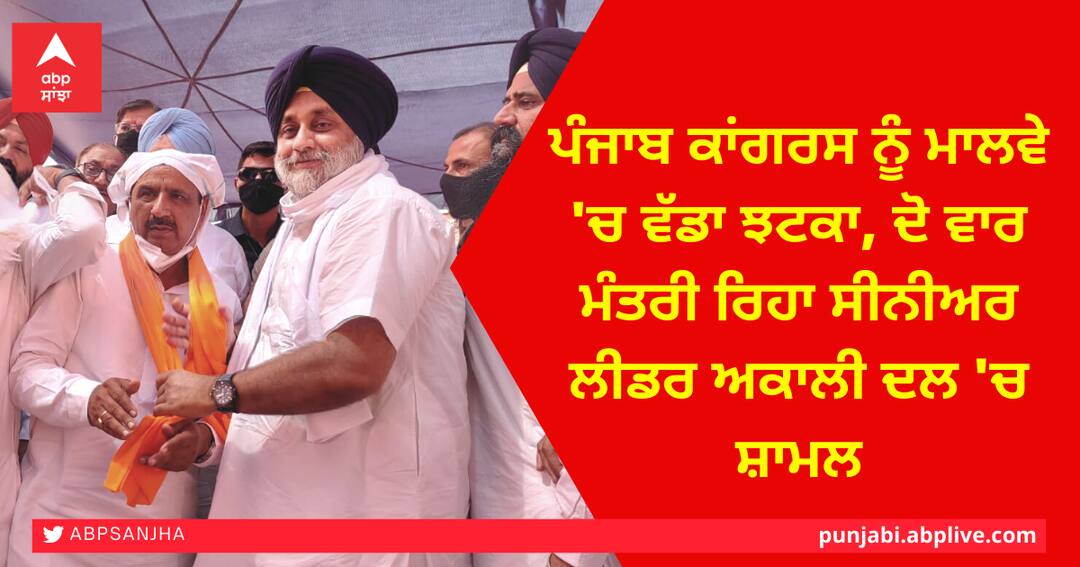 ਜਲਾਲਾਬਾਦ (ਫਾਜ਼ਿਲਕਾ) : ਮਾਲਵੇ 'ਚ ਕਾਂਗਰਸ ਨੂੰ ਇੱਕ ਵੱਡਾ ਝਟਕਾ ਲੱਗਾ ਹੈ। ਸੀਨੀਅਰ ਕਾਂਗਰਸੀ ਨੇਤਾ ਅਤੇ ਦੋ ਵਾਰ ਦੇ ਮੰਤਰੀ ਰਹੇ ਹੰਸ ਰਾਜ ਜੋਸਨ ਪਾਰਟੀ ਪ੍ਰਧਾਨ ਸੁਖਬੀਰ ਸਿੰਘ ਬਾਦਲ ਅਤੇ ਆਪਣੇ ਸੈਂਕੜੇ ਸਮਰਥਕਾਂ ਸਮੇਤ ਅੱਜ ਸ਼੍ਰੋਮਣੀ ਅਕਾਲੀ ਦਲ ਵਿੱਚ ਸ਼ਾਮਲ ਹੋ ਗਏ।