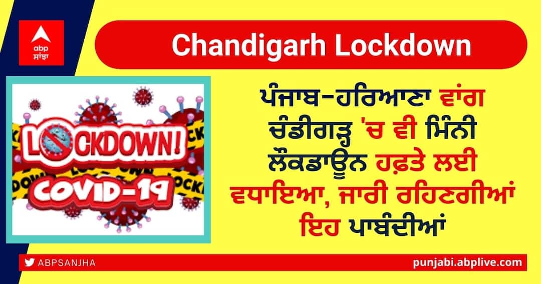 ਚੰਡੀਗੜ੍ਹ: ਕੋਰੋਨਾਵਾਇਰਸ (Coronavirus) ਦੇ ਵਧ ਰਹੇ ਕੇਸਾਂ 'ਚ ਕੁਝ ਕਮੀ ਆਉਣੀ ਸ਼ੁਰੂ ਹੋਈ ਹੈ ਪਰ ਇਸ ਦੇ ਨਾਲ ਸੂਬਿਆਂ ਨੇ ਅਜੇ ਪਾਬੰਦੀਆਂ (Corona Restrictions) 'ਚ ਢਿੱਲ ਦੇਣੀ ਸ਼ੁਰੂ ਨਹੀਂ ਕੀਤੀ। ਪੰਜਾਬ ਤੇ ਹਰਿਆਣਾ ਨੇ ਸੂਬਿਆਂ 'ਚ ਲੌਕਡਾਊਨ (Punjab-Haryana Lockdown) ਨੂੰ ਵਧਾ ਦਿੱਤਾ ਹੈ। ਇਸ ਦੇ ਨਾਲ ਹੀ ਹੁਣ ਚੰਡੀਗੜ੍ਹ ਪ੍ਰਸ਼ਾਸਨ (Chandigarh Administration) ਨੇ ਮਿੰਨੀ ਲੌਕਡਾਊਨ ਨੂੰ ਇੱਕ ਹਫ਼ਤੇ ਵਿੱਚ ਵਧਾ ਦਿੱਤਾ।
