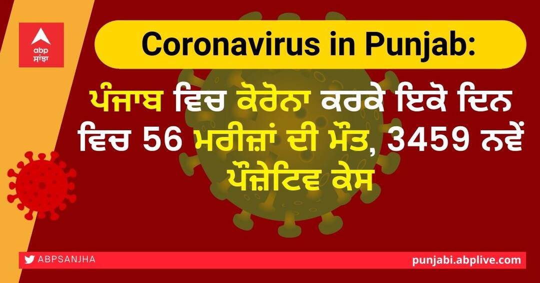 ਚੰਡੀਗੜ੍ਹ: ਪੰਜਾਬ ਵਿੱਚ ਕੋਰੋਨਾ ਕਰਕੇ ਮਰੀਜ਼ਾਂ ਦੀ ਮੌਤ ਦੀ ਰਫਤਾਰ ਰੁਕਣ ਦਾ ਨਾਂ ਨਹੀਂ ਲੈ ਰਹੀ। ਸ਼ੁੱਕਰਵਾਰ ਨੂੰ 56 ਲੋਕਾਂ ਦੀ ਮੌਤ ਹੋ ਗਈ, ਜਦੋਂ ਕਿ 3459 ਨਵੇਂ ਪੌਜ਼ੇਟਿਵ ਕੇਸ ਸਾਹਮਣੇ ਆਏ ਹਨ। ਵੀਰਵਾਰ ਨੂੰ 56 ਲੋਕਾਂ ਦੀ ਮੌਤ ਹੋ ਗਈ। ਹਾਸਲ ਜਾਣਕਾਰੀ ਮੁਤਾਬਕ ਸੂਬੇ 'ਚ ਕੁੱਲ 7390 ਲੋਕਾਂ ਦੀ ਮੌਤ ਹੋ ਚੁੱਕੀ ਹੈ। ਉਧਰ ਐਕਟਿਵ ਕੇਸਾਂ ਦੀ ਗਿਣਤੀ 27,219 'ਤੇ ਪਹੁੰਚ ਗਈ ਹੈ।