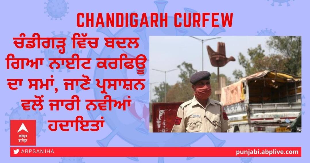 ਚੰਡੀਗੜ੍ਹ ਵਿੱਚ ਕੋਰੋਨਾ ਦੀ ਵਿਗੜਦੀ ਸਥਿਤੀ ਨਾਲ ਪ੍ਰਸ਼ਾਸਨ ਨੇ ਪੰਜਾਬ ਦੀ ਤਰਜ਼ ‘ਤੇ ਹੋਰ ਸਖ਼ਤੀ ਕਰ ਦਿੱਤੀ ਹੈ। ਯੂਟੀ ਪ੍ਰਸ਼ਾਸਨ ਮੁਤਾਬਕ ਹੁਣ ਸ਼ਾਮ 6 ਵਜੇ ਤੋਂ ਅਗਲੇ ਦਿਨ ਸਵੇਰ 5 ਵਜੇ ਤੱਕ ਕਰਫਿਊ ਰਹੇਗਾ। ਦੱਸ ਦਈਏ ਕਿ ਪਹਿਲਾ ਚੰਡੀਗੜ੍ਹ 'ਚ ਕਰਫਿਊ ਦਾ ਸਮਾਂ ਰਾਤ ਦੇ 10 ਵਜੇ ਤੋਂ ਸਵੇਰੇ ਪੰਜ ਵਜੇ ਦਾ ਸੀ। ਹੁਣ ਚੰਡੀਗੜ੍ਹ ਦੀਆਂ ਸਾਰੀਆਂ ਦੁਕਾਨਾਂ, ਮਾਲ, ਮਲਟੀਪਲੈਕਸਾਂ ਅਤੇ ਬਾਜ਼ਾਰਾਂ ਨੂੰ 5 ਵਜੇ ਤੋਂ ਬੰਦ ਰੱਖਣ ਦੇ ਆਦੇਸ਼ ਦਿੱਤੇ ਗਏ ਹਨ।