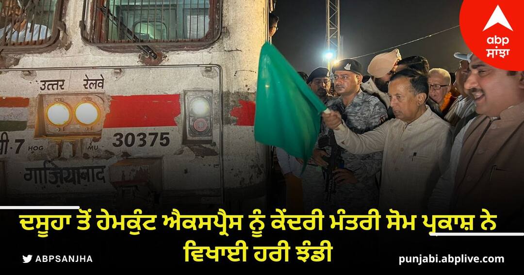 Punjab News: ਦਸੂਹਾ ਤੋਂ ਹੇਮਕੁੰਟ ਐਕਸਪ੍ਰੈਸ ਨੂੰ ਕੇਂਦਰੀ ਮੰਤਰੀ ਸੋਮ ਪ੍ਰਕਾਸ਼ ਨੇ ਹਰੀ ਝੰਡੀ ਦੇ ਕੇ ਰਵਾਨਾ ਕੀਤਾ। ਇਸ ਮੌਕੇ ਕੇਂਦਰੀ ਮੰਤਰੀ ਸੋਮ ਪ੍ਰਕਾਸ਼ ਨੇ ਕਿਹਾ ਕਿ ਇਲਾਕੇ ਦੇ ਲੋਕਾਂ ਵੱਲ਼ੋਂ ਹੇਮਕੁੰਟ ਐਕਸਪ੍ਰੈਸ ਦੇ ਦਸੂਹਾ ਵਿੱਚ ਰੁਕਣ ਲਈ ਚਿਕੋਕਣੀ ਮੰਗ ਸੀ ਜੋ ਕਿ ਹੁਣ ਪੂਰੀ ਹੋ ਗਈ ਹੈ। ਇਸ ਟਰੇਨ ਦੇ ਰੁਕਣ ਨਾਲ ਹਰਿਦੁਆਰ, ਰਿਸ਼ੀਕੇਸ਼ ਤੇ ਹੋਰ ਧਾਰਮਿਕ ਅਸਥਾਨਾਂ ਤੇ ਜਾਣ ਵਾਲੇ ਸ਼ਰਧਾਲੂਆਂ ਨੂੰ ਵੱਡੀ ਰਾਹਤ ਮਿਲੇਗੀ।