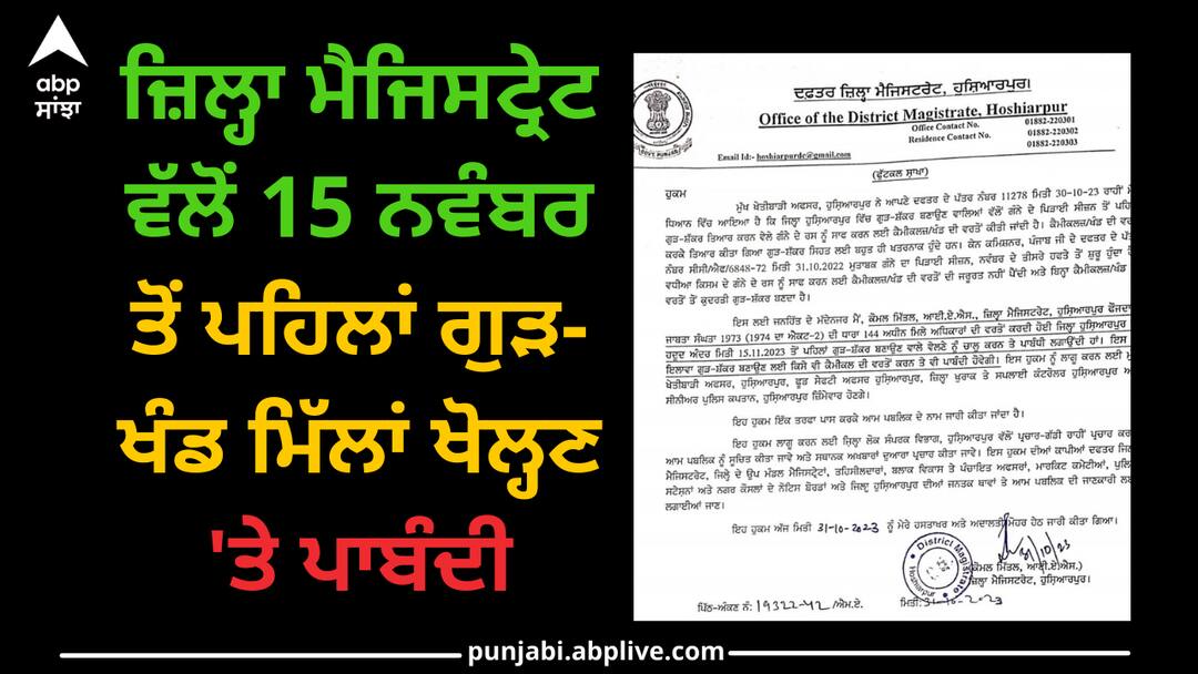 Hoshiarpur: ਜ਼ਿਲ੍ਹਾ ਮੈਜਿਸਟ੍ਰੇਟ ਹੁਸ਼ਿਆਰਪੁਰ ਕੋਮਲ ਮਿੱਤਲ ਨੇ ਫ਼ੌਜਦਾਰੀ ਜ਼ਾਬਤਾ ਸੰਘਤਾ 1973 (1974 ਦਾ ਐਕਟ ਨੰ: 2) ਦੀ ਧਾਰਾ 144 ਅਧੀਨ ਪ੍ਰਾਪਤ ਹੋਏ ਅਧਿਕਾਰਾਂ ਦੀ ਵਰਤੋਂ ਕਰਦਿਆਂ 15 ਨਵੰਬਰ 2023 ਤੋਂ ਪਹਿਲਾਂ ਜ਼ਿਲ੍ਹੇ ਦੀਆਂ ਹੱਦਾਂ ਅੰਦਰ ਗੁੜ-ਖੰਡ ਬਣਾਉਣ ਵਾਲੀਆਂ ਇਕਾਈਆਂ ਖੋਲ੍ਹਣ 'ਤੇ ਪਾਬੰਦੀ ਲਾਉਣ 'ਤੇ ਹੁਕਮ ਜਾਰੀ ਕੀਤੇ ਹਨ।