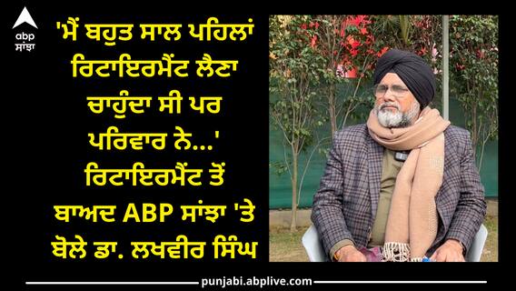 Dr. lakhvir singh interview on abp sanjha: ਪਿਛਲੇ ਦਿਨੀਂ ਸ਼ਲਾਘਾਯੋਗ ਸੇਵਾ ਤੋਂ ਬਆਦ ਜ਼ਿਲ੍ਹਾ ਸਿਹਤ ਅਫਸਰ ਡਾ. ਲਖਵੀਰ ਸਿੰਘ ਨੇ ਆਪਣੀ ਮਰਜ਼ੀ ਨਾਲ ਰਿਟਾਇਰਮੈਂਟ ਲੈ ਲਈ ਸੀ। ਇਸ ਤੋਂ ਬਾਅਦ ਧਾਕੜ ਅਫ਼ਸਰ ਡਾ. ਲਖਬੀਰ ਸਿੰਘ ਨੇ ਏਬੀਪੀ ਸਾਂਝਾ ਨਾਲ ਖ਼ਾਸ ਗੱਲਬਾਤ ਕੀਤੀ। ਇਸ ਦੌਰਾਨ ਉਨ੍ਹਾਂ ਨੇ ਆਪਣੀ ਰਿਟਾਇਰਮੈਂਟ ਨੂੰ ਲੈ ਕੇ ਕਈ ਗੱਲਾਂ ਸਾਂਝਾ ਕੀਤੀਆਂ ਅਤੇ ਕਿਹਾ ਕਿ ਮੈਂ ਆਪਣੀ ਮਰਜ਼ੀ ਨਾਲ ਰਿਟਾਇਰਮੈਂਟ ਲਈ ਹੈ। ਹੇਠਾਂ ਪੜ੍ਹੋ ਪੂਰੀ ਇੰਟਰਵਿਊ...