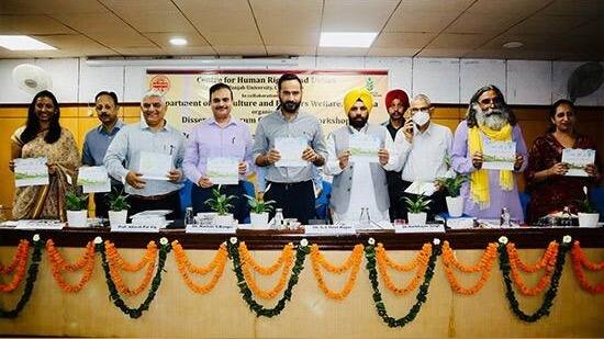 ਮੀਤ ਹੇਅਰ ਅੱਜ ਪੰਜਾਬ ਯੂਨੀਵਰਸਿਟੀ ਚੰਡੀਗੜ੍ਹ ਦੇ ਸੈਂਟਰ ਫਾਰ ਹਿਊਮਨ ਰਾਈਟਸ ਐਂਡ ਡਿਊਟੀਜ਼ ਵੱਲੋਂ ਖੇਤੀਬਾੜੀ ਅਤੇ ਕਿਸਾਨ ਭਲਾਈ ਵਿਭਾਗ, ਹਰਿਆਣਾ ਦੇ ਸਹਿਯੋਗ ਨਾਲ ਅੱਜ ਪੰਜਾਬ ਯੂਨੀਵਰਸਿਟੀ ਦੇ ਗੋਲਡਨ ਜੁਬਲੀ ਹਾਲ ਵਿੱਚ "ਸਥਾਈ ਖੇਤੀਬਾੜੀ ਪ੍ਰਬੰਧਨ ਲਈ ਫਸਲਾਂ ਦੀ ਰਹਿੰਦ-ਖੂੰਹਦ ਪ੍ਰਬੰਧਨ 'ਤੇ ਕਰਵਾਈ ਵਰਕਸ਼ਾਪ ਨੂੰ ਸੰਬੋਧਨ ਕਰ ਰਹੇ ਸਨ।