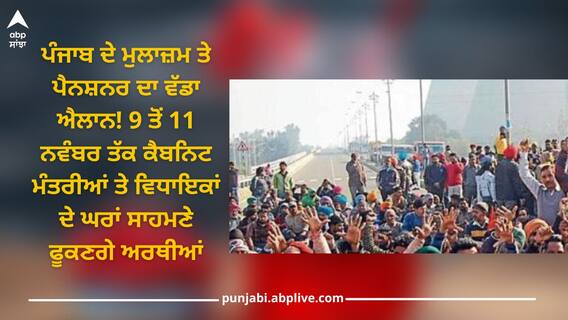 Punjab News: ਪੰਜਾਬ ਦੇ ਮੁਲਾਜ਼ਮ ਤੇ ਪੈਨਸ਼ਨਰ ਦਾ ਵੱਡਾ ਐਲਾਨ ਕਰ ਦਿੱਤਾ ਹੈ, ਜਿਸ ਕਰਕੇ ਹੁਣ 9 ਤੋਂ 11 ਨਵੰਬਰ ਤੱਕ ਕੈਬਨਿਟ ਮੰਤਰੀਆਂ ਤੇ ਵਿਧਾਇਕਾਂ ਦੇ ਘਰਾਂ ਸਾਹਮਣੇ ਅਰਥੀਆਂ ਫੂਕਣਗੇ। ਪੰਜਾਬ ਸਰਕਾਰ ਵੱਲੋਂ ਪੰਜਾਬ ਦੇ ਮੁਲਾਜ਼ਮਾਂ ਅਤੇ ਪੈਨਸ਼ਨਰਾਂ ਦੀਆਂ ਮੰਗਾਂ ਪ੍ਰਤੀ ਧਾਰੀ ਸਾਜ਼ਿਸ਼ੀ ਚੁੱਪ ਦੇ ਖ਼ਿਲਾਫ਼ ਹੁਣ ਕੈਬਨਿਟ ਮੰਤਰੀਆਂ ਅਤੇ ਆਪ ਵਿਧਾਇਕਾਂ ਦੇ ਘਰਾਂ ਅੱਗੇ ਹੁਣ 9 ਨਵੰਬਰ ਤੋਂ 11 ਨਵੰਬਰ ਤੱਕ ਅਰਥੀਆਂ ਫੂਕੀਆਂ ਜਾਣਗੀਆਂ।