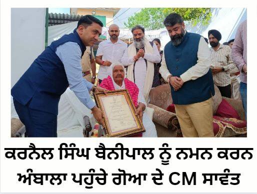Chandigarh News: ਗੋਆ ਦੇ ਸੀਐਮ ਪ੍ਰਮੋਦ ਸਾਵੰਤ ਨੇ ਗੋਆ ਦੀ ਆਜ਼ਾਦੀ ਅੰਦੋਲਨ ਵਿੱਚ ਕਰਨੈਲ ਸਿੰਘ ਬੈਨੀਪਾਲ ਦੇ ਯੋਗਦਾਨ ਨੂੰ ਯਾਦ ਕੀਤਾ। ਇਸ ਦੌਰਾਨ ਸੀਐਮ ਪ੍ਰਮੋਦ ਨੇ ਉਨ੍ਹਾਂ ਦੀ ਪਤਨੀ ਚਰਨਜੀਤ ਕੌਰ ਨੂੰ ਅੰਬਾਲਾ ਦੇ ਪਿੰਡ ਬਡੋਲਾ ਵਿੱਚ ਪਹੁੰਚ ਕੇ ਪ੍ਰਸ਼ੰਸਾ ਪੱਤਰ ਤੇ 10 ਲੱਖ ਰੁਪਏ ਦਿੱਤੇ।
