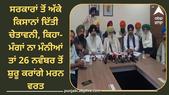 Farmer News: ਚੰਡੀਗੜ੍ਹ ਦੇ ਕਿਸਾਨ ਭਵਨ ਵਿਖੇ ਪੱਤਰਕਾਰਾਂ ਨਾਲ ਗੱਲਬਾਤ ਕਰਦਿਆਂ ਕਿਸਾਨ ਮਜ਼ਦੂਰ ਮੋਰਚਾ ਅਤੇ ਸੰਯੁਕਤ ਕਿਸਾਨ ਮੋਰਚਾ (ਗੈਰ-ਸਿਆਸੀ) ਨੇ ਮਰਨ ਵਰਤ ਰੱਖਣ ਦੀ ਚਿਤਾਵਨੀ ਦਿੱਤੀ ਹੈ। ਦੋਵਾਂ ਜਥੇਬੰਦੀਆਂ ਦੇ ਆਗੂਆਂ ਨੇ ਕੇਂਦਰ ਸਰਕਾਰ ਖ਼ਿਲਾਫ਼ ਚੁੱਕੇ ਜਾਣ ਵਾਲੇ ਕਦਮਾਂ ਦੀ ਜਾਣਕਾਰੀ ਦਿੱਤੀ। ਮੋਰਚੇ ਨੇ ਐਲਾਨ ਕੀਤਾ ਕਿ ਕਿਸਾਨ ਆਗੂ ਜਗਜੀਤ ਸਿੰਘ ਡੱਲੇਵਾਲ 26 ਨਵੰਬਰ ਤੋਂ ਖਨੌਰੀ ਸਰਹੱਦ ’ਤੇ ਮਰਨ ਵਰਤ ਸ਼ੁਰੂ ਕਰਨਗੇ ਜੇ ਉਨ੍ਹਾਂ ਦੀਆਂ ਮੰਗਾਂ ਨੂੰ ਅਣਗੌਲਿਆ ਕੀਤਾ ਗਿਆ।