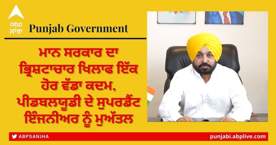 Punjab News: ਮਾਨ ਸਰਕਾਰ ਦਾ ਭ੍ਰਿਸ਼ਟਾਚਾਰ ਖਿਲਾਫ ਇੱਕ ਹੋਰ ਵੱਡਾ ਕਦਮ ਚੁੱਕਿਆ ਹੈ। ਦੱਸ ਦਈਏ ਕਿ ਹੁਣ ਪੰਜਾਬ ਸਰਕਾਰ ਨੇ ਪੀਡਬਲਯੂਡੀ ਦੇ ਸੁਪਰਡੈਂਟ ਇੰਜਨੀਅਰ ਨੂੰ ਮੁਅੱਤਲ ਕਰ ਦਿੱਤਾ ਗਿਆ ਹੈ। ਇਸ ਬਾਰੇ ਪੰਜਾਬ ਮੰਤਰੀ ਹਰਭਜਨ ਸਿੰਘ ਈ.ਟੀ.ਓ ਨੇ ਕਿਹਾ ਕਿਭ੍ਰਿਸ਼ਟਾਚਾਰ ਨੂੰ ਲੈ ਕੇ ਸਰਕਾਰ ਦੀ ਜ਼ੀਰੋ ਟਾਲਰੈਂਸ ਦੀ ਨੀਤੀ 'ਤੇ ਕੰਮ ਕਰ ਰਹੀ ਹੈ।