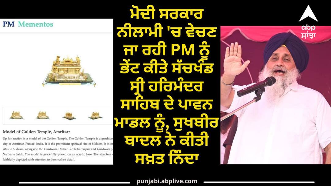 Golden Temple: ਪ੍ਰਧਾਨ ਮੰਤਰੀ ਨਰਿੰਦਰ ਮੋਦੀ ਨੂੰ ਦੇਸ਼-ਵਿਦੇਸ਼ ਤੋਂ ਮਿਲੇ ਤੋਹਫ਼ਿਆਂ ਦੀ ਨਿਲਾਮੀ ਹੋ ਰਹੀ ਹੈ। ਇਹ 2 ਅਕਤੂਬਰ ਤੋਂ ਸ਼ੁਰੂ ਹੋ ਗਿਆ ਹੈ। ਇਹ 31 ਅਕਤੂਬਰ ਨੂੰ ਖਤਮ ਹੋਵੇਗਾ। ਇਹ ਨਿਲਾਮੀ ਆਨਲਾਈਨ ਹੋ ਰਹੀ ਹੈ। ਪ੍ਰਧਾਨ ਮੰਤਰੀ ਦੇ ਤੋਹਫ਼ਿਆਂ ਦੀ ਈ-ਨਿਲਾਮੀ ਦਾ ਇਹ ਪੰਜਵਾਂ ਐਡੀਸ਼ਨ ਹੈ। ਇਸ ਦੇ ਲਈ pmmementos.gov.in ਨਾਮ ਦੀ ਵੈੱਬਸਾਈਟ ਬਣਾਈ ਗਈ ਹੈ। ਪਰ ਮੋਦੀ ਸਰਕਾਰ ਵੱਲੋਂ ਕੁਝ ਅਜਿਹਾ ਕੀਤਾ ਗਿਆ ਹੈ ਜਿਸ ਨੇ ਸਿੱਖ ਕੌਮ ਦੀਆਂ ਧਾਰਮਿਕ ਭਾਵਨਾਵਾਂ ਨੂੰ ਠੇਸ ਪਹੁੰਚੀ ਹੈ। ਜਿਸ ਦੀ ਸ਼੍ਰੋਮਣੀ ਅਕਾਲੀ ਦਲ ਦੇ ਪ੍ਰਧਾਨ ਸੁਖਬੀਰ ਸਿੰਘ ਬਾਦਲ ਵੱਲੋਂ ਸਖਤ ਸ਼ਬਦਾਂ ਦੇ ਵਿੱਚ ਨਿੰਦਾ ਕੀਤੀ ਗਈ ਹੈ।