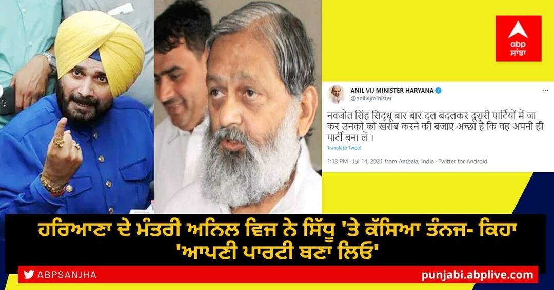 ਅਨਿਲ ਵਿਜ ਨੇ ਸਿੱਧੂ ਦੇ ਮਾਮਲੇ ਵਿਚ ਟਵੀਟ ਕੀਤਾ, 'ਨਵਜੋਤ ਸਿੰਘ ਸਿੱਧੂ ਵਾਰ-ਵਾਰ ਪਾਰਟੀਆਂ ਬਦਲ ਕੇ ਅਤੇ ਹੋਰ ਪਾਰਟੀਆਂ ਵਿਚ ਜਾ ਕੇ ਉਨ੍ਹਾਂ ਨੂੰ ਵਿਗਾੜਨ ਦੀ ਬਜਾਏ ਆਪਣੀ ਪਾਰਟੀ ਬਣਾ ਲੈਣ।'