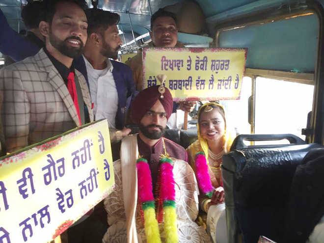ਵਿਆਹਾਂ 'ਤੇ ਅੰਨ੍ਹਾ ਖ਼ਰਚ ਕਰਨ ਵਾਲੇ ਪੰਜਾਬੀਆਂ ਲਈ ਮਿਸਾਲ ਬਣਿਆ NRI ਜੋੜਾ, ਬੱਸ ਰਾਹੀਂ ਢੁੱਕੀ ਬਰਾਤ ਤੇ ਟੈਂਪੂ 'ਚ ਡੋਲੀ