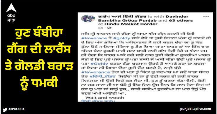 Gangster in Punjab: ਪੰਜਾਬ ਅੰਦਰ ਮੁੜ ਗੈਂਗਸਟਰ ਆਹਮੋ-ਸਾਹਮਣੇ ਹੋਏ ਹਨ। ਬੰਬੀਹਾ ਗਰੁੱਪ ਨੇ ਸੋਸ਼ਲ ਮੀਡੀਆ 'ਤੇ ਪੋਸਟ ਪਾ ਕੇ ਪੰਜਾਬੀ ਗਾਇਕ ਸਿੱਧੂ ਮੂਸੇਵਾਲਾ ਦੇ ਕਤਲ ਦੇ ਮਾਸਟਰਮਾਈਂਡ ਗੈਂਗਸਟਰ ਲਾਰੈਂਸ ਬਿਸ਼ਨੋਈ ਤੇ ਗੋਲਡੀ ਬਰਾੜ ਨੂੰ ਧਮਕੀ ਦਿੱਤੀ ਹੈ। ਬੰਬੀਹਾ ਗਰੁੱਪ ਨੇ ਕਿਹਾ ਹੈ ਕਿ ਲਾਰੈਂਸ ਬਿਸ਼ਨੋਈ ਤੇ ਗੋਲਡੀ ਬਰਾੜ ਦਗਾਬਾਜ਼ ਹਨ। ਉਨ੍ਹਾਂ ਅੱਗੇ ਲਾਰੈਂਸ ਬਿਸ਼ਨੋਈ ਨੂੰ ਚੁਣੌਤੀ ਦਿੰਦਿਆਂ ਕਿਹਾ ਹੈ ਕਿ ਉਹ ਕੌਣ ਹੈ ਜੋ ਖਾਲਿਸਤਾਨ ਨਹੀਂ ਬਣਨ ਦੇਣ ਦੇ ਦਾਅਵੇ ਕਰ ਰਿਹਾ ਹੈ।