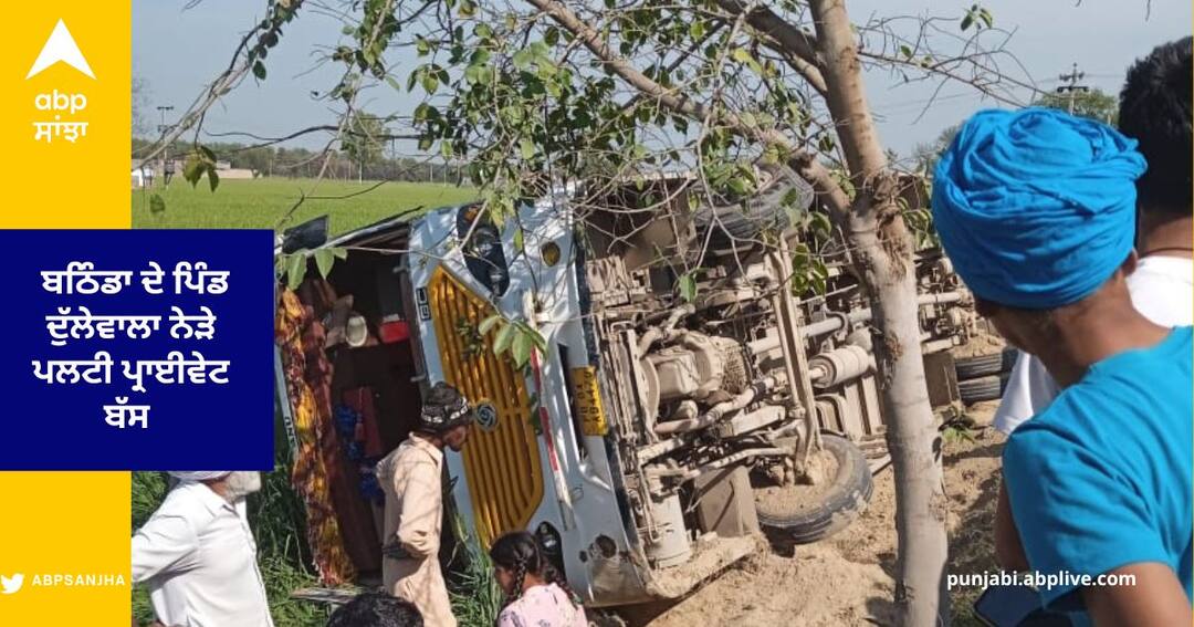 Bathinda News : ਬਠਿੰਡਾ ਦੇ ਪਿੰਡ ਦੁੱਲੇਵਾਲਾ ਦੇ ਨੇੜੇ ਇੱਕ ਪ੍ਰਾਈਵੇਟ ਬੱਸ ਪਲਟ ਗਈ ਹੈ , ਜਿਸ ਕਾਰਨ ਬੱਸ 'ਚ ਸਵਾਰ ਯਾਤਰੀ ਜ਼ਖਮੀ ਹੋ ਗਏ ਹਨ। ਜਾਣਕਾਰੀ ਅਨੁਸਾਰ ਸੰਤੁਲਨ ਵਿਗੜਣ ਕਾਰਨ ਬੱਸ ਪਿੰਡ ਦੇ ਖੇਤਾਂ ਵਿੱਚ ਪਲਟ ਗਈ ਹੈ।