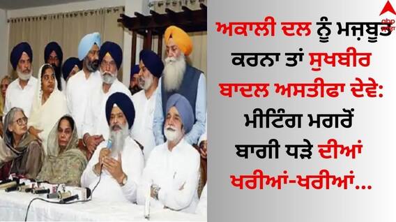 Punjab News: ਸ਼੍ਰੋਮਣੀ ਅਕਾਲੀ ਦਲ 'ਚ ਬਗਾਵਤ ਜ਼ੋਰਾਂ 'ਤੇ ਹੈ। ਇਸ ਨੂੰ ਲੈ ਕੇ ਅੱਜ ਮੀਟਿੰਗਾਂ ਦਾ ਦੌਰ ਜਾਰੀ ਰਿਹਾ। ਬਾਗੀ ਧੜੇ ਦੀ ਮੀਟਿੰਗ ਤੋਂ ਪਹਿਲਾਂ ਅਕਾਲੀ ਦਲ ਵੱਲੋਂ ਚੰਡੀਗੜ੍ਹ ਸਥਿਤ ਪਾਰਟੀ ਹੈੱਡਕੁਆਰਟਰ ਵਿਖੇ ਪਾਰਟੀ ਆਗੂਆਂ ਦੀ ਮੀਟਿੰਗ ਕੀਤੀ ਗਈ। ਇਹ ਮੀਟਿੰਗ ਦਲਜੀਤ ਸਿੰਘ ਚੀਮਾ ਤੇ ਬਲਵਿੰਦਰ ਸਿੰਘ ਭੂੰਦੜ ਦੀ ਅਗਵਾਈ ਹੇਠ ਹੋਈ।