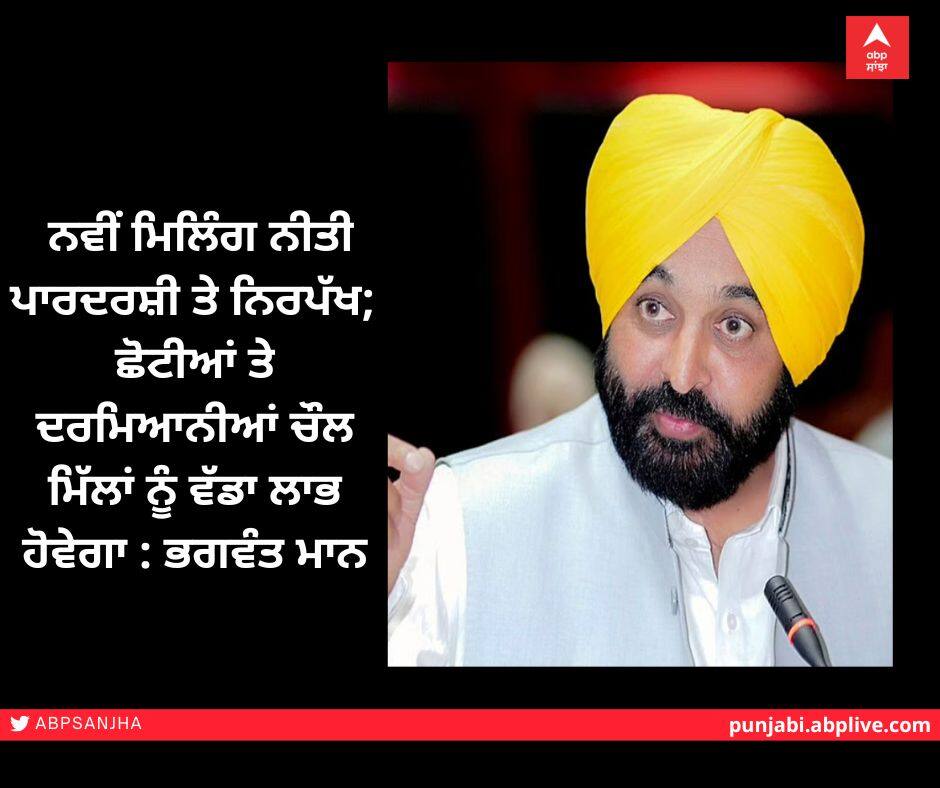 ਚੰਡੀਗੜ੍ਹ : ਪੰਜਾਬ ਦੇ ਮੁੱਖ ਮੰਤਰੀ ਭਗਵੰਤ ਮਾਨ ਨੇ ਕਿਹਾ ਹੈ ਕਿ ਸੂਬਾ ਸਰਕਾਰ ਨੇ ਇਕ ਮਿਸਾਲੀ ਪਹਿਲਕਦਮੀ ਵਿੱਚ ਇਤਿਹਾਸਕ ਸੁਧਾਰਾਂ ਵਾਲੀ ਸਾਉਣੀ ਮਿਲਿੰਗ ਨੀਤੀ 2022-23 ਪੇਸ਼ ਕੀਤੀ ਹੈ, ਜਿਸ ਦਾ ਉਦੇਸ਼ ਝੋਨੇ ਦੀ ਛੜਾਈ ਦੇ ਕੰਮ ਵਿੱਚ ਪਾਰਦਰਸ਼ਤਾ ਤੇ ਨਿਰਪੱਖਤਾ ਲਿਆਉਣਾ ਹੈ।