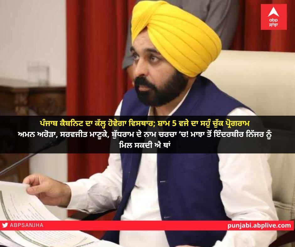 ਚੰਡੀਗੜ੍ਹ: ਪੰਜਾਬ ਕੈਬਨਿਟ ਦਾ ਕੱਲ੍ਹ ਵਿਸਥਾਰ ਹੋਵੇਗਾ। ਸੋਮਵਾਰ ਨੂੰ ਪੰਜਾਬ ਰਾਜ ਭਵਨ 'ਚ ਪੰਜ ਨਵੇਂ ਮੰਤਰੀ ਸਹੁੰ ਚੁੱਕਣਗੇ। ਭਗਵੰਤ ਮਾਨ ਦੇ ਮੰਤਰੀ ਮੰਡਲ ਦਾ ਇਹ ਪਹਿਲਾ ਵਿਸਥਾਰ ਹੈ। ਜ਼ਿਕਰਯੋਗ ਹੈ ਕਿ ਇਸ ਲਈ ਸ਼ਾਮ 5 ਵਜੇ ਦਾ ਪ੍ਰੋਗਰਾਮ ਰੱਖਿਆ ਗਿਆ ਹੈ। ਮੰਤਰੀ ਮੰਡਲ 'ਚ 4 ਜਾਂ 5 ਨਵੇਂ ਮੈਂਬਰ ਸ਼ਾਮਲ ਕੀਤੇ ਜਾ ਸਕਦੇ ਹਨ। ਇਸ ਵਿੱਚ ਇੱਕ ਮਹਿਲਾ ਵਿਧਾਇਕ ਸਰਵਜੀਤ ਕੌਰ ਮਾਣੂੰਕੇ ਵੀ ਹੋ ਸਕਦੇ ਹਨ।
