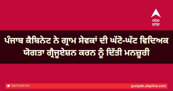 ਚੰਡੀਗੜ੍ਹ: ਪੇਂਡੂ ਵਿਕਾਸ ਅਤੇ ਪੰਚਾਇਤੀ ਵਿਭਾਗ ਦੀ ਕਾਰਜਕੁਸ਼ਲਤਾ ਵਧਾਉਣ ਲਈ, ਪੰਜਾਬ ਮੰਤਰੀ ਮੰਡਲ ਨੇ ਵੀਰਵਾਰ ਨੂੰ ਗ੍ਰਾਮ ਸੇਵਕਾਂ ਦੀ ਘੱਟੋ-ਘੱਟ ਯੋਗਤਾ ਨੂੰ ਮੈਟ੍ਰਿਕ ਤੋਂ ਗ੍ਰੈਜੂਏਸ਼ਨ ਤੱਕ ਵਧਾਉਣ ਦਾ ਫੈਸਲਾ ਕੀਤਾ ਹੈ।ਸਰਕਾਰੀ ਬੁਲਾਰੇ ਅਨੁਸਾਰ, ਪੇਂਡੂ ਵਿਕਾਸ ਅਤੇ ਪੰਚਾਇਤੀ ਵਿਭਾਗ (ਕਲਾਸ -3) ਸੇਵਾ ਨਿਯਮਾਂ, 1988 ਵਿੱਚ ਸੋਧ ਨੂੰ ਪ੍ਰਵਾਨਗੀ ਦੇ ਦਿੱਤੀ ਹੈ।