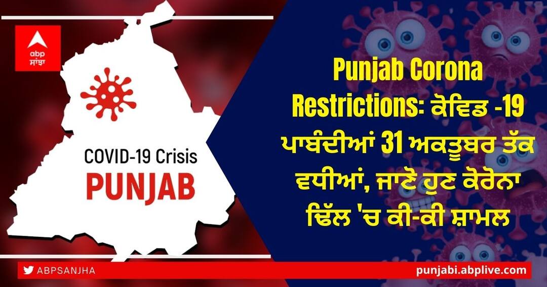 ਚੰਡੀਗੜ੍ਹ: ਪੰਜਾਬ ਸਰਕਾਰ ਨੇ ਸੂਬੇ 'ਚ ਲਾਗੂ ਕੋਵਿਡ -19 ਦੀਆਂ ਪਾਬੰਦੀਆਂ ਨੂੰ 31 ਅਕਤੂਬਰ ਤੱਕ ਵਧਾ ਦਿੱਤਾ ਹੈ। ਇਸ ਸਬੰਧੀ ਪੰਜਾਬ ਦੇ ਗ੍ਰਹਿ ਮਾਮਲਿਆਂ ਅਤੇ ਨਿਆਂ ਵਿਭਾਗ ਦੀ ਤਰਫੋਂ ਸਾਰੇ ਡਿਵੀਜ਼ਨਲ ਕਮਿਸ਼ਨਰਾਂ, ਡਿਪਟੀ ਕਮਿਸ਼ਨਰਾਂ ਅਤੇ ਸਾਰੇ ਜ਼ੋਨਲ ਆਈਜੀਜ਼, ਪੁਲਿਸ ਕਮਿਸ਼ਨਰਾਂ, ਡੀਆਈਜੀਜ਼ ਅਤੇ ਐਸਐਸਪੀਜ਼ ਨੂੰ ਇੱਕ ਪੱਤਰ ਜਾਰੀ ਕਰਦੇ ਹੋਏ ਕਿਹਾ ਗਿਆ ਹੈ ਕਿ ਸਿਰਫ ਉਹੀ ਲੋਕ ਹੋਣਗੇ ਸੂਬੇ ਵਿੱਚ ਦਾਖਲਾ ਦਿੱਤਾ ਜਾਵੇ ਜਿਨ੍ਹਾਂ ਕੋਲ 72 ਘੰਟੇ ਪਹਿਲਾਂ ਦੀ ਆਰਟੀਪੀਸੀਆਰ ਦੀ ਨੈਗੇਟਿਵ ਰਿਪੋਰਟ ਆਵੇਗੀ। ਉਨ੍ਹਾਂ ਯਾਤਰੀਆਂ ਲਈ ਰੈਟ ਟੈਸਟ ਲਾਜ਼ਮੀ ਕਰ ਦਿੱਤਾ ਗਿਆ ਹੈ ਜੋ ਬਿਨਾਂ ਰਿਪੋਰਟ ਦੇ ਪੰਜਾਬ ਪਹੁੰਚਣਗੇ।