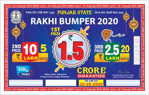 ਚੰਡੀਗੜ੍ਹ: ਪੰਜਾਬ ਰਾਜ ਲਾਟਰੀਜ਼ ਵਿਭਾਗ ਵੱਲੋਂ ਰਾਖੀ ਬੰਪਰ-2020 ਲਾਂਚ ਕੀਤਾ ਗਿਆ ਹੈ। ਪੰਜਾਬ ਸਰਕਾਰ ਦਾ ਰਾਖੀ ਬੰਪਰ ਦੇਸ਼ ਭਰ ਵਿੱਚ ਕਈਆਂ ਲਈ ਆਸਾਂ ਦੀ ਤੰਦ ਬਣ ਗਿਆ ਹੈ। ਪੰਜਾਬ ਰਾਜ ਲਾਟਰੀਜ਼ ਵਿਭਾਗ ਦੀਆਂ ਬੰਪਰ ਯੋਜਨਾਵਾਂ ਰਾਤੋ-ਰਾਤ ਕਰੋੜਪਤੀ ਬਣਨ ਦਾ ਸੁਨਹਿਰੀ ਮੌਕਾ ਪ੍ਰਦਾਨ ਕਰਦੀਆਂ ਹਨ।