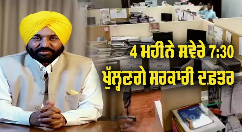 ਪੰਜਾਬ ਸਰਕਾਰ ਦੇ ਸਾਰੇ ਸਰਕਾਰੀ ਦਫ਼ਤਰ ਅਗਲੇ ਸਾਲ ਗਰਮੀਆਂ ਵਿੱਚ ਢਾਈ ਨਹੀਂ ਸਗੋਂ ਚਾਰ ਮਹੀਨੇ ਸਵੇਰੇ 7:30 ਵਜੇ ਖੁੱਲ੍ਹਣਗੇ। ਇਸ ਵਾਰ ਸਰਕਾਰ ਨੇ ਇਹ ਫੈਸਲਾ 2 ਮਈ ਤੋਂ 15 ਜੁਲਾਈ ਤੱਕ ਦਫਤਰ ਜਲਦੀ ਖੋਲ੍ਹਣ ਦੇ ਸਕਾਰਾਤਮਕ ਨਤੀਜੇ ਮਿਲਣ ਤੋਂ ਬਾਅਦ ਲਿਆ ਹੈ। ਇਸ ਨੂੰ ਸਾਲ 2024 ਵਿੱਚ 1 ਅਪ੍ਰੈਲ ਤੋਂ 31 ਜੁਲਾਈ ਤੱਕ ਲਾਗੂ ਕੀਤਾ ਜਾਵੇਗਾ।