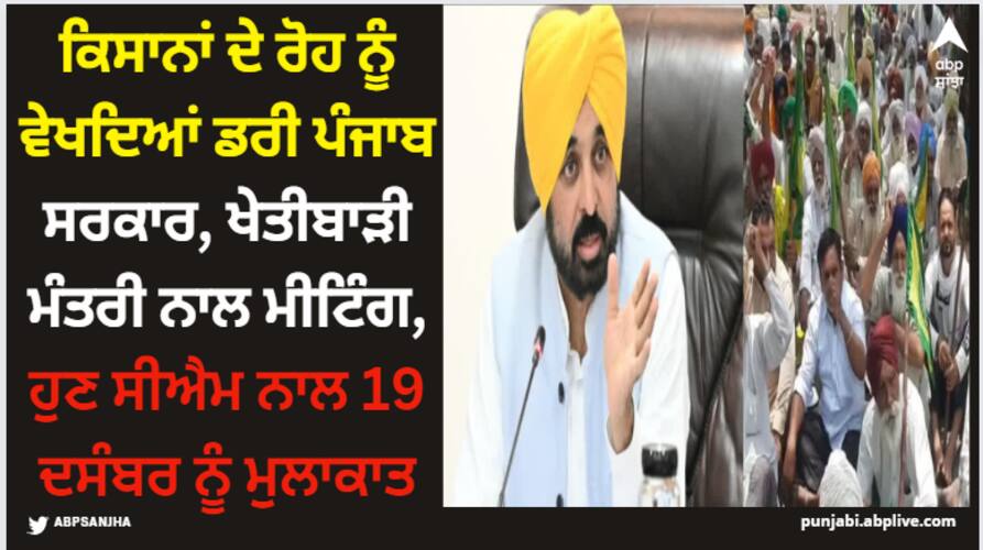 Farmers Protest: ਕਿਸਾਨਾਂ ਦੇ ਰੋਹ ਨੂੰ ਵੇਖਦਿਆਂ ਪੰਜਾਬ ਸਰਕਾਰ ਹਰਕਤ ਵਿੱਚ ਆਈ ਹੈ। ਅੱਜ ਪੰਜਾਬ ਦੇ ਖੇਤੀਬਾੜੀ ਮੰਤਰੀ ਗੁਰਮੀਤ ਖੁੱਡੀਆਂ ਨੇ ਪੰਜਾਬ ਭਵਨ ਵਿੱਚ ਕਿਸਾਨਾਂ ਨਾਲ ਮੀਟਿੰਗ ਕੀਤੀ। ਮੀਟਿੰਗ ਮਗਰੋਂ ਕਿਸਾਨ ਆਗੂਆਂ ਨੇ ਕਿਹਾ ਕਿ ਹਾਲੇ ਕੁਝ ਵੀ ਤੈਅ ਨਹੀਂ ਹੋਇਆ। ਹੁਣ 19 ਦਸੰਬਰ ਨੂੰ ਸੀਐਮ ਭਗਵੰਤ ਮਾਨ ਨਾਲ ਮੀਟਿੰਗ ਹੋਵੇਗੀ। ਇਸ ਵਿੱਚ ਸਬੰਧਤ ਵਿਭਾਗਾਂ ਦੇ ਅਧਿਕਾਰੀਆਂ ਨੂੰ ਵੀ ਬੁਲਾਇਆ ਜਾਵੇਗਾ। ਇਸ ਤੋਂ ਬਾਅਦ ਕਿਸੇ ਤਰ੍ਹਾਂ ਦਾ ਐਲਾਨ ਕੀਤਾ ਜਾ ਸਕਦਾ ਹੈ।