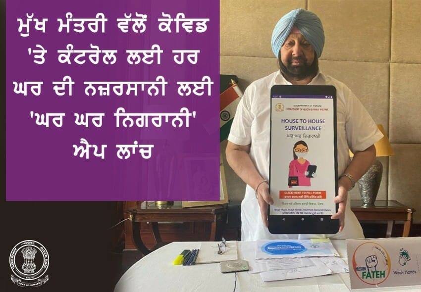 ਚੰਡੀਗੜ੍ਹ: ਕੋਰੋਨਾ ਵਾਇਰਸ ਦੇ ਸਮਾਜਿਕ ਫੈਲਾਅ ਨੂੰ ਠੱਲਣ ਲਈ ਪੰਜਾਬ ਸਰਕਾਰ ਵੱਲੋਂ ਨਿਵੇਕਲੀ ਪਹਿਲ ਕੀਤੀ ਗਈ ਹੈ। ਇਸ ਤਹਿਤ ਪੰਜਾਬ ਦੇ ਮੁੱਖ ਮੰਤਰੀ ਕੈਪਟਨ ਅਮਰਿੰਦਰ ਸਿੰਘ ਨੇ 'ਘਰ ਘਰ ਨਿਗਰਾਨੀ' ਮੋਬਾਇਲ ਐਪ ਲਾਂਚ ਕੀਤੀ ਹੈ। ਇਸ ਐਪ ਜ਼ਰੀਏ ਸੂਬੇ ਦੇ ਹਰ ਘਰ 'ਤੇ ਉਦੋਂ ਤੱਕ ਨਜ਼ਰ ਰੱਖੀ ਜਾਵੇਗੀ ਜਦੋਂ ਤੱਕ ਇਸ ਮਹਾਂਮਾਰੀ ਦਾ ਮੁਕੰਮਲ ਖਾਤਮਾ ਨਹੀਂ ਹੋ ਜਾਂਦਾ।