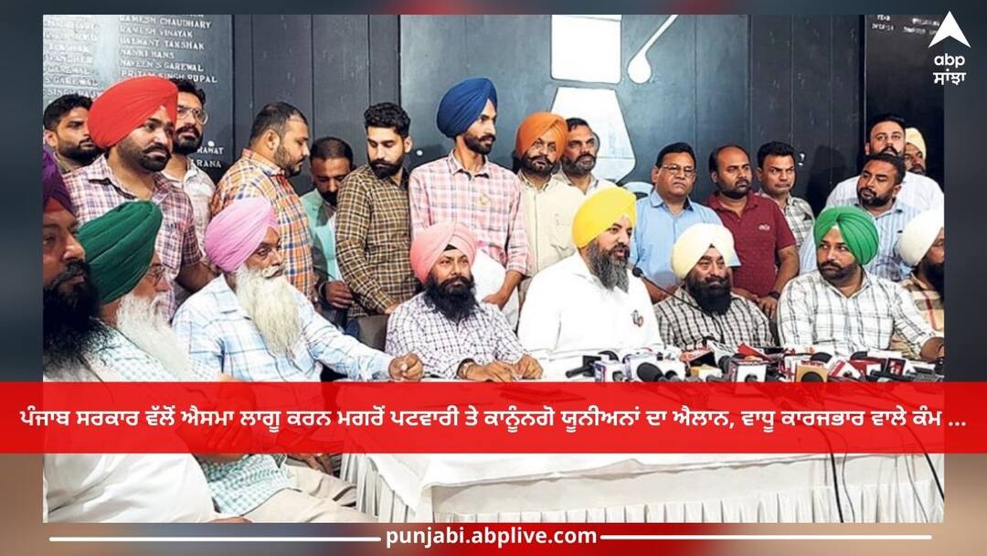 ਦੱਸ ਦਈਏ ਕਿ ਪੰਜਾਬ ਵਿੱਚ ਮਾਲ ਅਫ਼ਸਰਾਂ ਤੇ ਡੀਸੀ ਦਫ਼ਤਰ ਦੇ ਕਾਮਿਆਂ ਦੀ ‘ਕਲਮ ਛੋੜ ਹੜਤਾਲ’ ਦੇ ਸੱਦੇ ਮਗਰੋਂ ਸੂਬਾ ਸਰਕਾਰ ਵੱਲੋਂ ਐਸਮਾ ਲਾਗੂ ਕਰਨ ਦਾ ਐਲਾਨ ਕੀਤਾ ਹੈ। ਇਸ ਦੀ ਪਰਵਾਹ ਨਾ ਕਰਦੇ ਹੋਏ ਪਟਵਾਰੀ ਤੇ ਕਾਨੂੰਨਗੋ ਯੂਨੀਅਨਾਂ ਵੱਲੋਂ ਸੰਘਰਸ਼ ਜਾਰੀ ਰੱਖਣ ਦਾ ਐਲਾਨ ਕਰ ਦਿੱਤਾ ਗਿਆ ਹੈ। ਇਸ ਐਲਾਨ ਨਾਲ ਅੱਜ ਤੋਂ ਵਾਧੂ ਕਾਰਜਭਾਰ ਵਾਲੇ 3193 ਸਰਕਲਾਂ ਵਿੱਚ ਲਗਪਗ 9 ਹਜ਼ਾਰ ਪਿੰਡ ਪਟਵਾਰੀਆਂ ਤੇ ਕਾਨੂੰਨਗੋਆਂ ਵੱਲੋਂ ਕੀਤੇ ਜਾਣ ਵਾਲੇ ਕੰਮਕਾਜ ਤੋਂ ਸੱਖਣੇ ਹੋ ਜਾਣਗੇ।