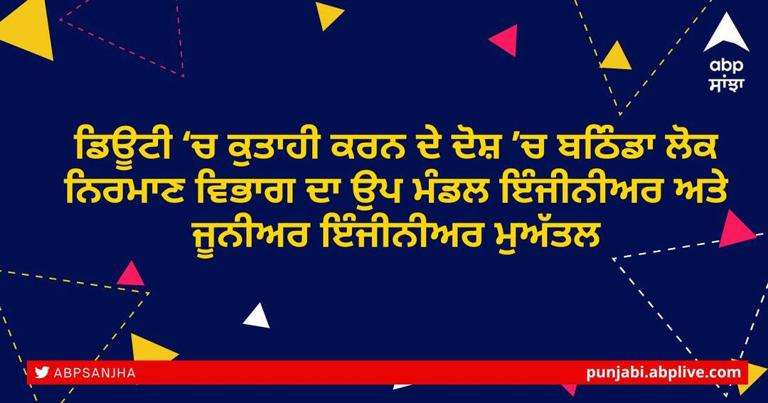 ਚੰਡੀਗੜ੍ਹ: ਪੰਜਾਬ ਦੇ ਮੁੱਖ ਮੰਤਰੀ ਭਗਵੰਤ ਸਿੰਘ ਮਾਨ ਵੱਲੋਂ ਸੂਬੇ ਦੇ ਲੋਕਾਂ ਨੂੰ ਸਾਫ਼ ਸੁਥਰਾ ਤੇ ਪਾਰਦਰਸ਼ੀ ਪ੍ਰਸ਼ਾਸਨ ਦੇਣ ਦੇ ਦਿਸ਼ਾ-ਨਿਰਦੇਸ਼ਾਂ ਤਹਿਤ ਅੱਜ ਲੋਕ ਨਿਰਮਾਣ ਵਿਭਾਗ ਦੇ ਉਸਾਰੀ ਮੰਡਲ ਨੰ: 3, ਬਠਿੰਡਾ ਵਿਖੇ ਤਾਇਨਾਤ ਉਪ ਮੰਡਲ ਇੰਜੀਨੀਅਰ ਸੁਖਪ੍ਰੀਤ ਸਿੰਘ ਅਤੇ ਜੂਨੀਅਰ ਇੰਜੀਨੀਅਰ ਨਵੀਨ ਕੁਮਾਰ ਨੂੰ ਪੰਜਾਬ ਸਿਵਲ ਸੇਵਾਵਾਂ (ਸਜਾ ਤੇ ਅਪੀਲ) ਨਿਯਮਾਂਵਲੀ 1970 ਦੇ ਨਿਯਮ 4 ਤਹਿਤ ਤੁਰੰਤ ਪ੍ਰਭਾਵ ਤੋਂ ਸਰਕਾਰੀ ਸੇਵਾ ਤੋਂ ਮੁਅੱਤਲ ਕੀਤਾ ਗਿਆ ਹੈ।