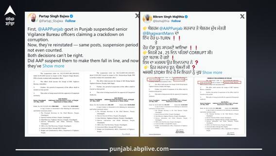 ਕਾਂਗਰਸ ਨੇਤਾ ਅਤੇ ਲੀਡਰ ਅਪੋਜ਼ੀਸ਼ਨ ਪ੍ਰਤਾਪ ਸਿੰਘ ਬਾਜਵਾ ਨੇ ਕਿਹਾ ਕਿ ਪੰਜਾਬ ਸਰਕਾਰ ਨੇ ਭ੍ਰਿਸ਼ਟਾਚਾਰ 'ਤੇ ਨਕੇਲ ਕੱਸਣ ਦਾ ਦਾਅਵਾ ਕਰਦੇ ਹੋਏ ਵਿਜਿਲੈਂਸ ਬਿਊਰੋ ਦੇ ਸੀਨੀਅਰ ਅਧਿਕਾਰੀਆਂ ਨੂੰ ਸਸਪੈਂਡ ਕੀਤਾ ਸੀ। ਹੁਣ ਉਹਨਾਂ ਨੂੰ ਮੁੜ ਬਹਾਲ ਕਰ ਦਿੱਤਾ ਗਿਆ ਹੈ ਅਤੇ ਉਹ ਆਪਣੇ ਹੀ ਪਦਾਂ 'ਤੇ ਹਨ। ਸਸਪੈਂਸ਼ਨ ਦੀ ਮਿਆਦ ਦੀ ਗਿਣਤੀ ਵੀ ਨਹੀਂ ਕੀਤੀ ਗਈ। ਦੋਵੇਂ ਫੈਸਲੇ ਸਹੀ ਨਹੀਂ ਹੋ ਸਕਦੇ। ਕੀ ਤੁਸੀਂ ਉਹਨਾਂ ਨੂੰ ਆਪਣੇ ਨਿਯਮਾਂ ਦੇ ਮੁਤਾਬਕ ਚਲਣ ਲਈ ਸਸਪੈਂਡ ਕੀਤਾ ਸੀ ਤੇ ਹੁਣ ਉਹਨਾਂ ਨੇ ਉਸ ਦੀ ਪਾਲਣਾ ਕੀਤੀ ਹੈ? ਇਹ ਸੱਤਾ ਨਹੀਂ, ਇਹ ਧਮਕੀ ਹੈ।