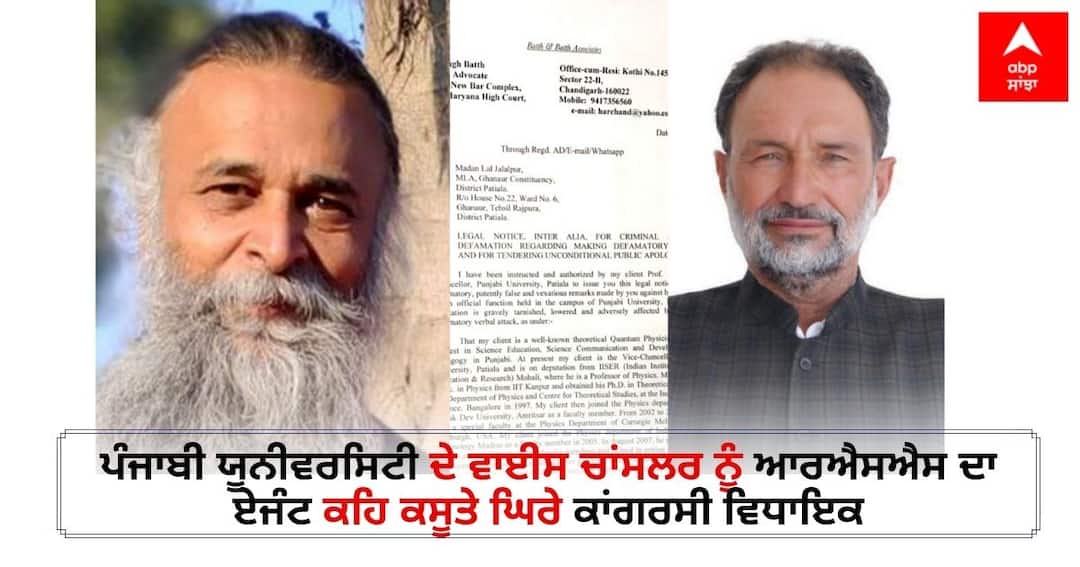 ਪਟਿਆਲਾ: ਪੰਜਾਬੀ ਯੂਨੀਵਰਸਿਟੀ ਦੇ ਵਾਈਸ ਚਾਂਸਲਰ ਡਾ. ਅਰਵਿੰਦ ਨੂੰ ਆਰਐਸਐਸ ਦਾ ਏਜੰਟ ਕਹਿ ਕੇ ਹਲਕਾ ਘਨੌਰ ਦੇ ਕਾਂਗਰਸੀ ਵਿਧਾਇਕ ਮਦਨ ਲਾਲ ਜਲਾਲਪੁਰ ਕਸੂਤੇ ਘਿਰ ਗਏ ਹਨ। ਵਾਈਸ ਚਾਂਸਲਰ ਨੇ ਵਿਧਾਇਕ ਮਦਨ ਲਾਲ ਜਲਾਲਪੁਰ ਨੂੰ ਕਾਨੂੰਨੀ ਨੋਟਿਸ ਭੇਜ ਕੇ 29 ਕਰੋੜ ਦੇ ਮਾਣਹਾਨੀ ਕੇਸ ਦੀ ਚੇਤਾਵਨੀ ਦਿੱਤੀ ਹੈ।