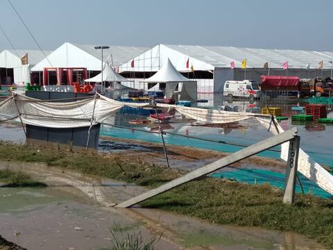 ਜਲੰਧਰ: ਸ਼੍ਰੀ ਗੁਰੂ ਨਾਨਕ ਦੇਵ ਜੀ ਦੇ 550ਵੇਂ ਪ੍ਰਕਾਸ਼ ਪੁਰਬ ਤੋਂ ਪਹਿਲਾਂ ਹੋਈ ਬਾਰਸ਼ ਨੇ ਸਮਾਗਮਾਂ ਦੇ ਸਾਰੇ ਪ੍ਰਬੰਧਾਂ 'ਤੇ ਪਾਣੀ ਫੇਰ ਦਿੱਤਾ ਹੈ। ਡੇਰਾ ਬਾਬਾ ਨਾਨਕ ਵਿਖੇ ਹੋਣ ਵਾਲੇ ਅੱਜ ਦੇ ਪ੍ਰੋਗਰਾਮ ਤਾਂ ਰੱਦ ਹੀ ਕਰਨੇ ਪਏ। ਇਸ ਤੋਂ ਇਲਾਵਾ ਸੁਲਤਾਨਪੁਰ ਲੋਧੀ ਵਿਖੇ ਵੀ ਬਾਰਸ਼ ਕਾਰਨ ਟੈਂਟ ਸਿਟੀ ਤੇ ਪੰਡਾਲ ਨੂੰ ਨੁਕਸਾਨ ਪਹੁੰਚਿਆ ਹੈ। ਅੱਜ ਸਵੇਰ ਤੋਂ ਹੀ ਪਾਣੀ ਤੇ ਚਿੱਕੜ ਨਾਲ ਭਰੇ ਟੈਂਟ ਸਿਟੀ ਦੀ ਮਰੰਮਤ ਸ਼ੁਰੂ ਹੋ ਗਈ। ਉਂਝ ਮਰੰਮਤ ਦੇ ਇੰਤਜ਼ਾਮ ਵੇਖ ਕੇ ਲੱਗਦਾ ਨਹੀਂ ਕਿ ਇਹ ਕੰਮ ਇੰਨੀ ਹਾਲਾਤ ਸੁਧਰ ਸਕਣਗੇ। ਹਾਲੇ ਬੱਤੀ ਵੀ ਬਹਾਲ ਨਹੀਂ ਹੋ ਸਕੀ। ਇਸ ਤੋਂ ਇਲਾਵਾ ਬਾਰਸ਼ ਕਰਕੇ ਆਰਜ਼ੀ ਰਸਤੇ ਵੀ ਬੰਦ ਹਨ। ਦੱਸ ਦਈਏ ਕਿ ਪਿਛਲੇ ਦਿਨ ਤੇਜ਼ ਹਵਾ ਤੇ ਮੀਂਹ ਨਾਲ ਸੁਲਤਾਨਪੁਰ ਲੋਧੀ ਵਿੱਚ ਬਣੇ ਟੈਂਟ ਸਿਟੀ ਵਿੱਚ ਪਾਣੀ ਆ ਗਿਆ। ਇਸ ਮਗਰੋਂ ਇਹਤਿਆਤ ਵਜੋਂ ਪ੍ਰਸ਼ਾਸਨ ਨੇ ਟੈਂਟ ਸਿਟੀ ਦੀ ਬਿਜਲੀ ਬੰਦ ਕਰ ਦਿੱਤੀ। ਪਿੰਡ ਬੁੱਸੋਵਾਲ ਨੇੜੇ ਜਿਥੇ ਵੀਵੀਆਈਪੀਜ਼ ਲਈ ਹੈਲੀਪੈਡ ਬਣਾਏ ਗਏ ਹਨ, ਉੱਥੇ ਐਸਜੀਪੀਸੀ ਵੱਲੋਂ ਬਣਾਇਆ ਗਿਆ ਸਵਾਗਤੀ ਗੇਟ ਡਿੱਗਣ ਨਾਲ ਇੱਕ ਪੁਲਿਸ ਮੁਲਾਜ਼ਮ ਦੀ ਲੱਤ ’ਤੇ ਸੱਟ ਲੱਗ ਗਈ। ਇਸੇ ਤਰ੍ਹਾਂ ਰੇਲਵੇ ਸਟੇਸ਼ਨ ’ਤੇ ਚੱਲ ਰਹੇ ਸਮਾਗਮ ’ਚ ਟੈਂਟ ਦਾ ਇੱਕ ਹਿੱਸਾ ਡਿੱਗਣ ਨਾਲ ਦੋ ਮਹਿਲਾ ਮੁਲਾਜ਼ਮਾਂ ਦੇ ਹਲਕੀਆਂ ਸੱਟਾਂ ਲੱਗੀਆਂ। ਜ਼ਿਲ੍ਹਾ ਪ੍ਰਸ਼ਾਸਨ ਦਾ ਕਹਿਣਾ ਹੈ ਕਿ ਮੀਂਹ ਦਾ ਪਾਣੀ ਕਿਸੇ ਵੀ ਟੈਂਟ ਵਿੱਚ ਨਹੀਂ ਵੜਿਆ ਪਰ ਟੈਂਟ ਸਿਟੀ ਦੇ ਕੰਪਲੈਕਸ ਵਿੱਚ ਪਾਣੀ ਖੜ੍ਹਾ ਹੋਣ ਕਾਰਨ ਬਿਜਲੀ ਬੰਦ ਕਰਨੀ ਪਈ ਤਾਂ ਜੋ ਕੋਈ ਅਣਸੁਖਾਵੀਂ ਘਟਨਾ ਨਾ ਵਾਪਰ ਸਕੇ। ਪੰਜਾਬ ਸਰਕਾਰ ਵੱਲੋਂ ਬਣਾਏ ਗਏ ਮੁੱਖ ਪੰਡਾਲ ਦੇ ਨੇੜੇ ਹੀ ਲੱਗੀ ਗੁਰੂ ਨਾਨਕ ਪ੍ਰਦਰਸ਼ਨੀ ਦੇ ਤੇਜ਼ ਹਨ੍ਹੇਰੀ ਨਾਲ ਬੋਰਡ ਵੀ ਡਿੱਗ ਪਏ।