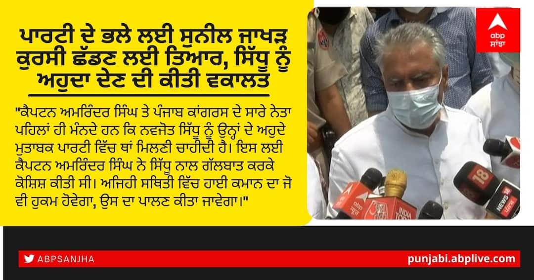 ਨਵਜੋਤ ਸਿੱਧੂ ਨੂੰ ਸਤਿਕਾਰਤ ਅਹੁਦਾ ਦੇਣ ਦੇ ਪ੍ਰਸਤਾਵ 'ਤੇ ਜਾਖੜ ਨੇ ਕਿਹਾ, "ਕੈਪਟਨ ਅਮਰਿੰਦਰ ਸਿੰਘ ਤੇ ਪੰਜਾਬ ਕਾਂਗਰਸ ਦੇ ਸਾਰੇ ਨੇਤਾ ਪਹਿਲਾਂ ਹੀ ਮੰਨਦੇ ਹਨ ਕਿ ਨਵਜੋਤ ਸਿੱਧੂ ਨੂੰ ਉਨ੍ਹਾਂ ਦੇ ਅਹੁਦੇ ਮੁਤਾਬਕ ਪਾਰਟੀ ਵਿੱਚ ਥਾਂ ਮਿਲਣੀ ਚਾਹੀਦੀ ਹੈ। ਇਸ ਲਈ ਕੈਪਟਨ ਅਮਰਿੰਦਰ ਸਿੰਘ ਨੇ ਸਿੱਧੂ ਨਾਲ ਗੱਲਬਾਤ ਕਰਕੇ ਕੋਸ਼ਿਸ਼ ਕੀਤੀ ਸੀ। ਅਜਿਹੀ ਸਥਿਤੀ ਵਿੱਚ ਹਾਈ ਕਮਾਨ ਦਾ ਜੋ ਵੀ ਹੁਕਮ ਹੋਵੇਗਾ, ਉਸ ਦਾ ਪਾਲਣ ਕੀਤਾ ਜਾਵੇਗਾ।"