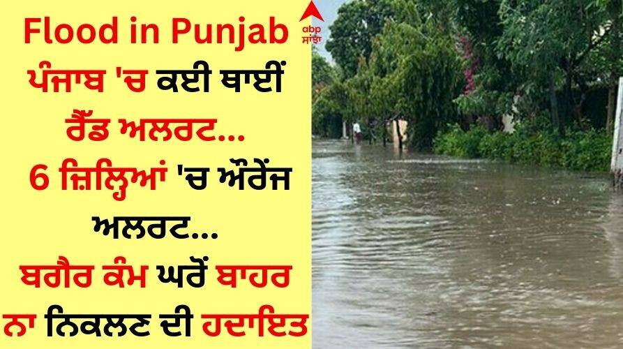 Flood in Punjab: ਪੰਜਾਬ ਵਿੱਚ ਮਾਨਸੂਨ ਨੇ ਆਪਣਾ ਜ਼ੋਰ ਦਿਖਾਉਣਾ ਸ਼ੁਰੂ ਕਰ ਦਿੱਤਾ ਹੈ। ਐਤਵਾਰ ਨੂੰ ਪੰਜਾਬ ਦੇ 6 ਇਲਾਕਿਆਂ 'ਚ ਰੈੱਡ ਅਲਰਟ ਜਾਰੀ ਕੀਤਾ ਗਿਆ ਹੈ। ਯਾਨੀ ਇੱਥੇ ਭਾਰੀ ਬਾਰਸ਼ ਤਾਂ ਹੋਵੇਗੀ ਹੀ ਸਗੋਂ ਨਾ ਹੀ 60 ਕਿਲੋਮੀਟਰ ਪ੍ਰਤੀ ਘੰਟੇ ਦੀ ਰਫ਼ਤਾਰ ਨਾਲ ਹਵਾਵਾਂ ਵੀ ਚੱਲਣਗੀਆਂ।