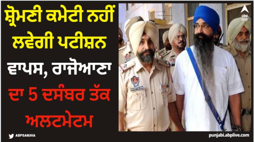 ਦਰਅਸਲ ਸ਼੍ਰੋਮਣੀ ਕਮੇਟੀ ਨੇ ਪੰਥਕ ਨੁਮਾਇੰਦਿਆਂ ਨਾਲ ਮੀਟਿੰਗ ਤੋਂ ਬਾਅਦ ਅੱਜ ਅੰਤਰਿੰਗ ਕਮੇਟੀ ਦੀ ਮੀਟਿੰਗ ਵਿੱਚ ਰਾਜੋਆਣਾ ਦੀ ਫਾਂਸੀ ਦੀ ਸਜ਼ਾ ਮੁਆਫ਼ੀ ਸਬੰਧੀ ਦਾਇਰ ਪਟੀਸ਼ਨ ਨੂੰ ਵਾਪਸ ਨਾ ਲੈਣ ਫੈਸਲਾ ਕੀਤਾ ਹੈ। ਸ਼੍ਰੋਮਣੀ ਕਮੇਟੀ ਨੇ ਰਾਜੋਆਣਾ ਨੂੰ ਅਪੀਲ ਕੀਤੀ ਹੈ ਕਿ ਉਹ 5 ਦਸੰਬਰ ਨੂੰ ਭੁੱਖ ਹੜਤਾਲ ਕਰਨ ਦਾ ਫੈਸਲਾ ਵਾਪਸ ਲੈਣ। ਇਸ ਦੌਰਾਨ ਸ਼੍ਰੋਮਣੀ ਕਮੇਟੀ ਵੱਲੋਂ 20 ਦਸੰਬਰ ਨੂੰ ਇਸ ਮਾਮਲੇ ਨੂੰ ਲੈ ਕੇ ਦਿੱਲੀ ਵਿੱਚ ਰੋਸ ਪ੍ਰਦਰਸ਼ਨ ਕਰਨ ਅਤੇ ਰਾਸ਼ਟਰਪਤੀ ਨੂੰ ਰਾਜੋਆਣਾ ਦੀ ਫਾਂਸੀ ਦੀ ਸਜ਼ਾ ਮੁਆਫੀ ਸਬੰਧੀ 26 ਲੱਖ ਲੋਕਾਂ ਵੱਲੋਂ ਭਰੇ ਗਏ ਪਰਫਾਰਮੇ ਸੌਂਪੇ ਜਾਣਗੇ।