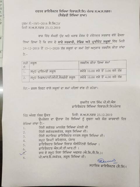 ਪੰਜਾਬ ਵਿੱਚ ਪੈ ਰਹੀ ਸੰਘਣੀ ਧੁੰਦ ਤੇ ਖ਼ਰਾਬ ਮੌਸਮ ਦੇ ਮੱਦੇਨਜ਼ਰ ਸਿੱਖਿਆ ਵਿਭਾਗ ਵੱਲੋਂ ਰਾਜ ਦੇ ਸਾਰੇ ਸਰਕਾਰੀ, ਏਡਿਡ ਤੇ ਪ੍ਰਾਈਵੇਟ ਸਕੂਲਾਂ ਵਿੱਚ ਮਿਤੀ 24-12-2019 ਤੋਂ 15-01-2020 ਤੱਕ ਸਮੂਹ ਸਰਕਾਰੀ, ਏਡਿਡ ਤੇ ਪ੍ਰਾਈਵੇਟ ਸਕੂਲਾਂ ਦਾ ਸਮਾਂ ਤਬਦੀਲ ਕਰ ਦਿੱਤਾ ਗਿਆ ਹੈ।