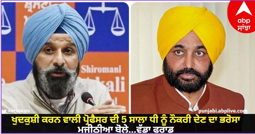 ਮਜੀਠੀਆ ਨੇ ਟਵੀਟ ਕਰਕੇ ਕਿਹਾ....ਝੂਠੀਆਂ ਗਰੰਟੀਆਂ ਦੇ ਕੇ ਸੱਤਾ ਹਾਸਲ ਕਰਨ ਵਾਲੇ ਮੁੱਖ ਮੰਤਰੀ ਭਗਵੰਤ ਮਾਨ ਦਾ ਸਭ ਤੋਂ ਵੱਡਾ ਫਰਾਡ ਪੰਜਾਬੀਆਂ ਸਾਹਮਣੇ ਹੈ...ਖੁਦਕੁਸ਼ੀ ਕਰਨ ਵਾਲੀ ਅਸਿਸਟੈਂਟ ਪ੍ਰੋਫੈਸਰ ਬਲਵਿੰਦਰ ਕੌਰ ਦੀ ਧੀ ਨਵਨੀਤ ਕੌਰ ਹਾਲੇ ਸਿਰਫ 5 ਸਾਲਾ ਦੀ ਹੈ....ਭਗਵੰਤ ਮਾਨ ਜੀ ਨੇ ਗਰੰਟੀ ਦਿੱਤੀ ਹੈ ਕਿ ਨਵਨੀਤ ਕੌਰ ਨੂੰ ’ਯੋਗ ਸਮੇਂ ’ਤੇ’ ਯੋਗਤਾ ਦੇ ਆਧਾਰ ’ਤੇ ਢੁਕਵਾਂ ਰੋਜ਼ਗਾਰ ਦਿੱਤਾ ਜਾਵੇਗਾ....ਭਗਵੰਤ ਮਾਨ ਸਾਹਿਬ ਨਵਨੀਤ 13 ਸਾਲਾਂ ਬਾਅਦ 18 ਸਾਲਾਂ ਦੀ ਹੋਵੇਗੀ...ਉਦੋਂ ਕਿਸਦੀ ਸਰਕਾਰ ਹੋਵੇਗੀ....ਕੌਣ ਅਫਸਰ ਹੋਵੇਗਾ....ਪਲ ਦਾ ਵਿਸਾਹ ਨਹੀਂ ਸੱਜਣਾ ਤੁਸੀਂ ਤਾਂ 13 ਸਾਲਾਂ ਬਾਅਦ ਦੀ ਗਰੰਟੀ ਦੇ ਦਿੱਤੀ ਹੈ....ਤੁਹਾਡੀ ਇਹ ਗਰੰਟੀ ਪਰਿਵਾਰ ਤੇ ਪੰਜਾਬ ਨਾਲ ਸਭ ਤੋਂ ਵੱਡਾ ਧੋਖਾ/ਫਰਾਡ ਹੈ ਜਿਸ ਲਈ ਪੰਜਾਬੀ ਤੁਹਾਨੂੰ ਕਦੇ ਮੁਆਫ ਨਹੀਂ ਕਰਨਗੇ...ਧੋਖੇਬਾਜ਼ ਸਰਕਾਰ ਮੁਰਦਾਬਾਦ...ਮੁਰਦਾਬਾਦ