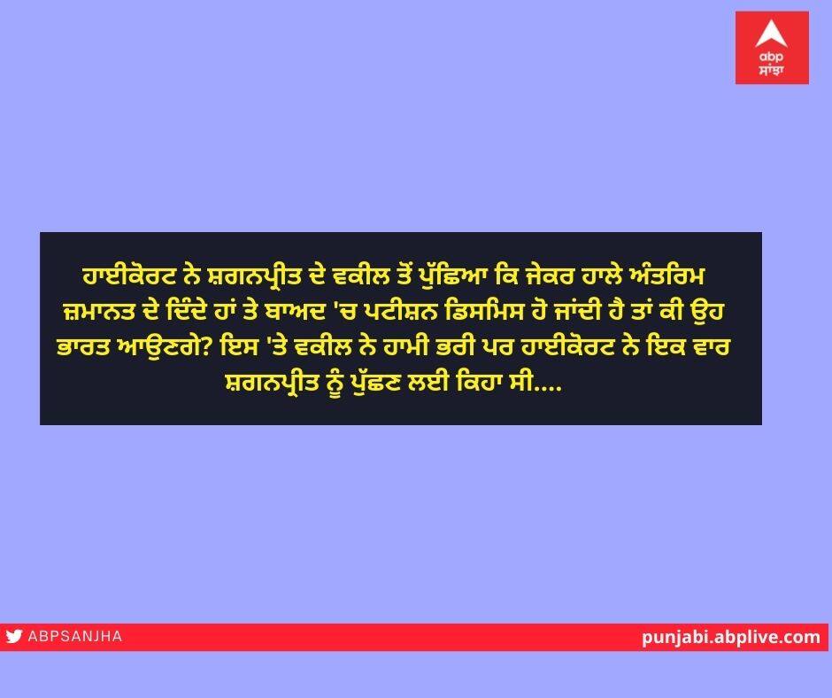 ਇਸ ਮਾਮਲੇ 'ਚ ਹਾਈਕੋਰਟ ਨੇ ਅਗਾਊਂ ਜ਼ਮਾਨਤ ਦੀ ਅਰਜ਼ੀ 'ਤੇ ਸੁਣਵਾਈ ਦੌਰਾਨ ਵਕੀਲ ਨੂੰ ਪੁੱਛਿਆ ਕਿ ਸ਼ਗਨਪ੍ਰੀਤ ਇਸ ਸਮੇਂ ਕਿੱਥੇ ਹੈ? ਇਸ 'ਤੇ ਸ਼ਗਨਪ੍ਰੀਤ ਦੇ ਵਕੀਲ ਨੇ ਕਿਹਾ ਕਿ ਉਹ ਫਿਲਹਾਲ ਆਸਟ੍ਰੇਲੀਆ 'ਚ ਹੈ। ਅਦਾਲਤ ਨੇ ਕਿਹਾ ਕਿ ਜੇਕਰ ਉਹ ਭਾਰਤ ਤੋਂ ਬਾਹਰ ਹੈ ਤਾਂ ਉਸ ਨੂੰ ਕੋਈ ਖਤਰਾ ਨਹੀਂ ਹੈ ਪਰੰਤੂ ਵਕੀਲ ਵਿਨੋਦ ਘਈ ਨੇ ਕਿਹਾ ਕਿ ਸ਼ਗਨਪ੍ਰੀਤ ਭਾਰਤ ਆਉਣਾ ਚਾਹੁੰਦਾ ਹੈ ਅਤੇ ਟਿਕਟ ਵੀ ਬੁੱਕ ਕੀਤੀ ਹੋਈ ਹੈ। ਇਸ 'ਤੇ ਹਾਈਕੋਰਟ ਨੇ ਕਿਹਾ ਕਿ ਜੇਕਰ ਉਹ ਹੁਣ ਦੇਸ਼ ਤੋਂ ਬਾਹਰ ਹੈ ਤਾਂ ਖ਼ਤਰਾ ਕਿਵੇਂ ਹੈ? ਇਸ 'ਤੇ ਸ਼ਗਨਪ੍ਰੀਤ ਦੇ ਵਕੀਲ ਨੇ ਕਿਹਾ ਕਿ ਉਹ ਭਾਰਤ ਵਾਪਸ ਆਉਣਾ ਚਾਹੁੰਦਾ ਹੈ। ਹਾਲਾਂਕਿ ਉਹ ਭਾਰਤ ਆਉਣਗੇ ਪਰ ਇਸ ਸਬੰਧੀ ਕੋਈ ਹਲਫ਼ਨਾਮਾ ਦਾਖ਼ਲ ਨਹੀਂ ਕੀਤਾ ਗਿਆ ਹੈ। ਇਸ ਤੋਂ ਬਾਅਦ ਹਾਈਕੋਰਟ ਨੇ ਸ਼ਗਨਪ੍ਰੀਤ ਦੇ ਵਕੀਲ ਨੂੰ ਮਾਮਲੇ 'ਚ ਸਟੇਟਸ ਰਿਪੋਰਟ ਦਾਖਲ ਕਰਨ ਲਈ ਕਿਹਾ ਅਤੇ ਮਾਮਲੇ ਦੀ ਸੁਣਵਾਈ 4 ਜੁਲਾਈ ਤੱਕ ਮੁਲਤਵੀ ਕਰ ਦਿੱਤੀ ਹੈ।