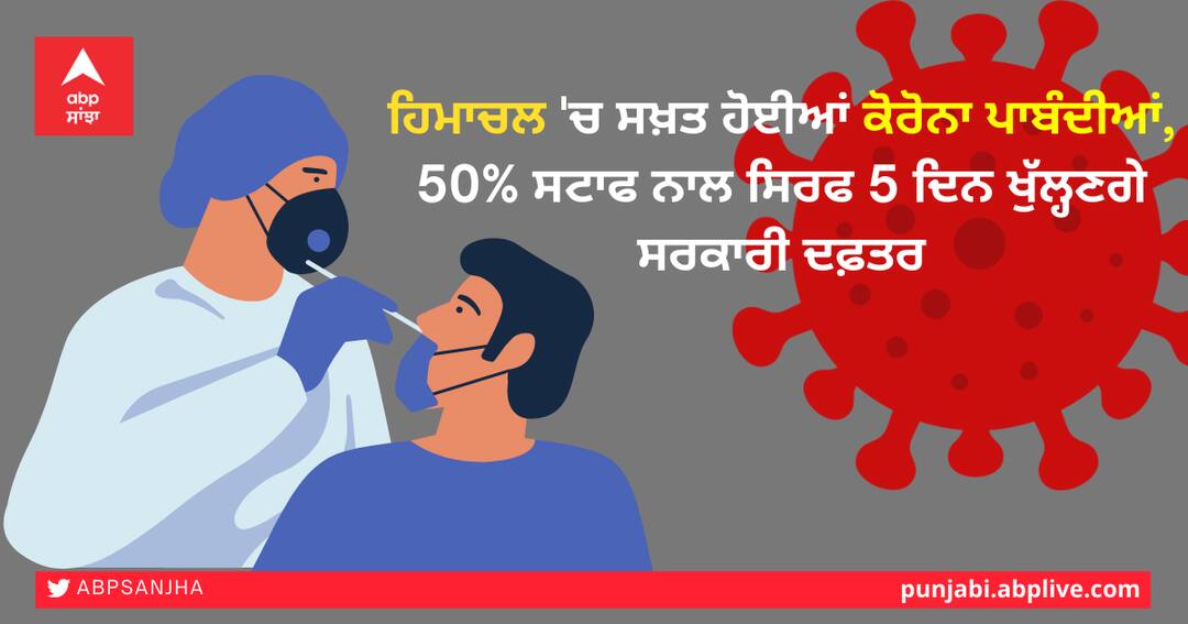 ਸ਼ਿਮਲਾ: ਕੋਰੋਨਾ ਦੇ ਵਧਦੇ ਮਾਮਲਿਆਂ ਨੂੰ ਲੈ ਕੇ ਹਿਮਾਚਲ ਸਰਕਾਰ ਨੇ ਪਾਬੰਦੀਆਂ ਵਧਾ ਦਿੱਤੀਆਂ ਹਨ। ਹੁਣ ਵਿਆਹਾਂ ਸ਼ਾਦੀਆਂ ਤੇ ਹੋਰ ਸਮਾਜਿਕ-ਧਾਰਮਿਕ ਪ੍ਰੋਗਰਾਮਾਂ ਵਿੱਚ ਸਿਰਫ 50 ਲੋਕ ਹੀ ਸ਼ਾਮਲ ਹੋ ਸਕਣਗੇ। ਇਸ ਦੇ ਨਾਲ ਹੀ ਸਰਕਾਰੀ ਦਫ਼ਤਰਾਂ ਵਿੱਚ ਸਿਰਫ 50% ਸਟਾਫ ਨਾਲ ਪੰਜ ਦਿਨ ਹੀ ਕੰਮ ਹੋਵੇਗਾ।