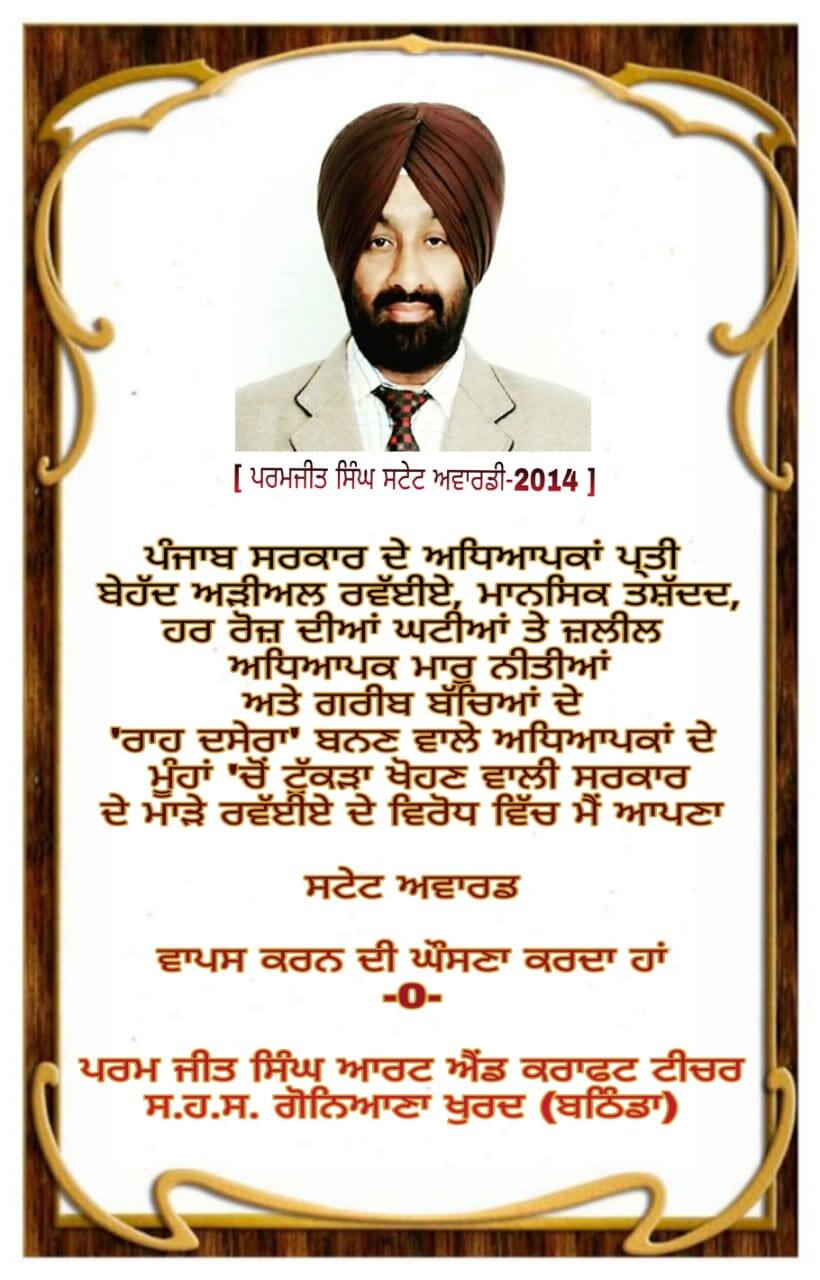 ਸਿੱਖਿਆ ਮੰਤਰੀ ਦੀ ਸਖ਼ਤੀ ਖਿਲਾਫ ਸਟੇਟ ਐਵਾਰਡ ਮੋੜਿਆ