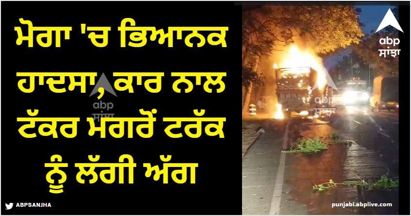 Moga News: ਮੋਗਾ ਦੇ ਸਿੰਘਾਵਾਲਾ ਬਿਜਲੀ ਘਰ ਦੇ ਬਾਹਰ ਸੀਮਿੰਟ ਨਾਲ ਭਰੇ ਟਰੱਕ ਦੀ ਕਾਰ ਨਾਲ ਆਹਮੋ-ਸਾਹਮਣੇ ਟੱਕਰ ਹੋ ਗਈ। ਇਸ ਦੌਰਾਨ ਟਰੱਕ ਨੂੰ ਭਿਆਨਕ ਅੱਗ ਲੱਗ ਗਈ। ਹਾਦਸੇ ਮਗਰੋਂ ਟਰੱਕ ਚਾਲਕ ਮੌਕੇ ਤੋਂ ਫਰਾਰ ਹੋ ਗਿਆ। ਕਰੀਬ ਡੇਢ ਘੰਟੇ ਬਾਅਦ ਕਾਰ ਚਾਲਕ ਨੂੰ ਕਾਰ 'ਚੋਂ ਕੱਢਿਆ ਗਿਆ।