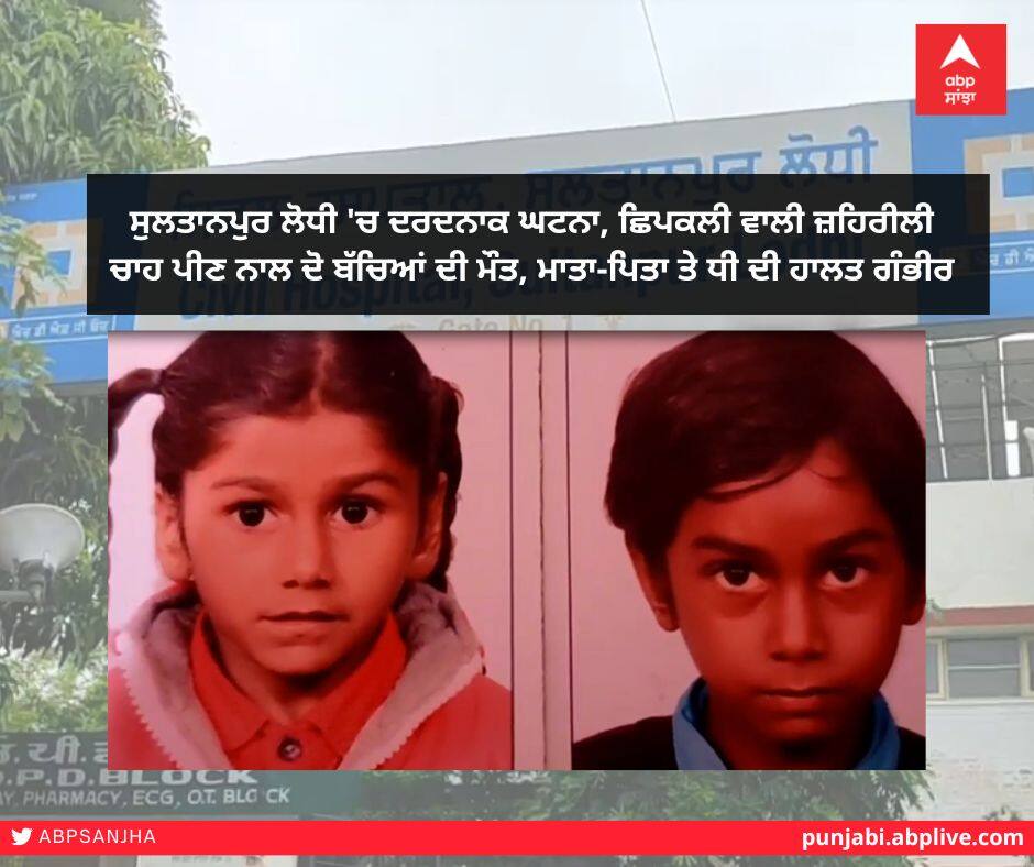 ਸੁਲਤਾਨਪੁਰ ਲੋਧੀ: ਸੁਲਤਾਨਪੁਰ ਲੋਧੀ ਦੇ ਮੰਡ ਖੇਤਰ ਨਾਲ ਸਬੰਧਤ ਪਿੰਡ ਤਕੀਆਂ ਵਿੱਚ ਰੂਹ ਨੂੰ ਝੰਜੋੜ ਦੇਣ ਵਾਲੀ ਦੁਖਦਾਈ ਘਟਨਾ ਸਾਹਮਣੇ ਆਈ ਹੈ। ਇੱਥੇ ਇੱਕ ਹੀ ਪਰਿਵਾਰ ਦੇ 5 ਜੀਅ ਕਥਿਤ ਤੌਰ ਤੇ ਛਿਪਕਲੀ ਵਾਲੀ ਜ਼ਹਿਰੀਲੀ ਚਾਹ ਪੀਣ ਕਾਰਨ ਗੰਭੀਰ ਰੂਪ ਵਿੱਚ ਬਿਮਾਰ ਹੋ ਗਏ ਹਨ। ਇਨ੍ਹਾਂ ਵਿੱਚੋਂ ਦੋ ਬੱਚਿਆਂ ਦੀ ਮੌਤ ਹੋ ਗਈ ਹੈ।