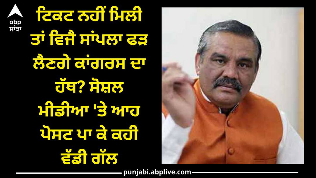 Punjab news: ਹੁਸ਼ਿਆਰਪੁਰ ਲੋਕ ਸਭਾ ਸੀਟ ਤੋਂ ਟਿਕਟ ਕੱਟਣ ਤੋਂ ਬਾਅਦ ਭਾਜਪਾ ਦੇ ਸਾਬਕਾ ਸਾਂਸਦ ਵਿਜੈ ਸਾਂਪਲਾ ਨੇ ਨਾਰਾਜ਼ਗੀ ਜ਼ਾਹਰ ਕੀਤੀ ਹੈ। ਸਾਂਪਲਾ ਨੇ ਸੋਸ਼ਲ ਮੀਡੀਆ ਪਲੇਟਫਾਰਮ ਐਕਸ 'ਤੇ ਇੱਕ ਪੋਸਟ ਰਾਹੀਂ ਭਾਜਪਾ ਤੋਂ ਆਪਣੇ ਰਾਹ ਵਖਰੇ ਹੋਣ ਦਾ ਇਸ਼ਾਰਾ ਕੀਤਾ।