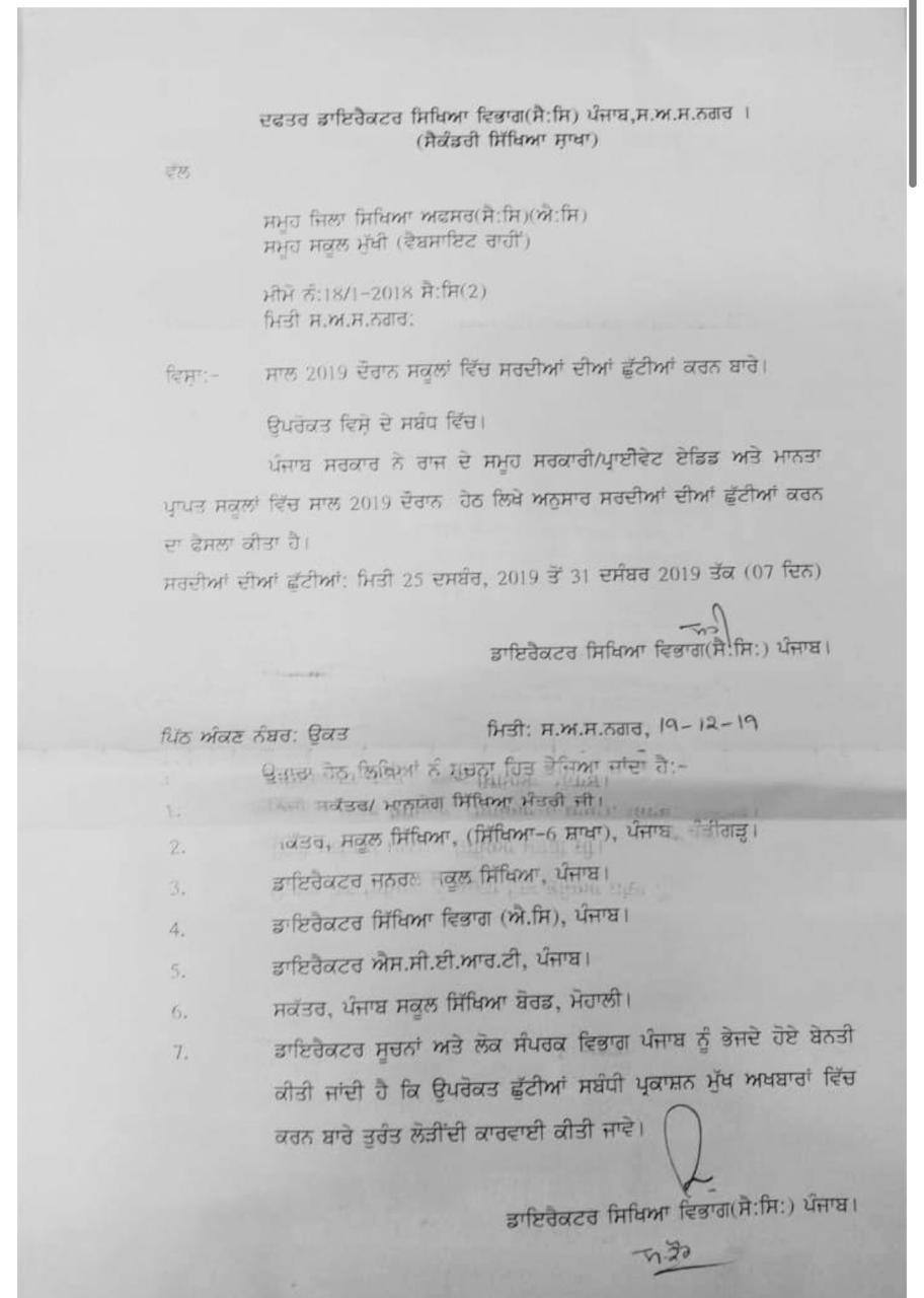 ਪੰਜਾਬ ਦੇ ਸਾਰੇ ਸਕੂਲਾਂ ਵਿੱਚ ਸਰਕਾਰ ਵੱਲੋਂ 25 ਤੋਂ 31 ਦਸੰਬਰ ਤੱਕ ਸਰਦੀਆਂ ਦੀਆਂ ਛੁੱਟੀਆਂ ਕਰ ਦਿੱਤੀਆਂ ਹਨ। ਪੰਜਾਬ ਸਿੱਖਿਆ ਵਿਭਾਗ ਵੱਲੋਂ ਨੋਟੀਫ਼ਿਕੇਸ਼ਨ ਜਾਰੀ ਕੀਤਾ ਕਰ ਦਿੱਤਾ ਗਿਆ ਹੈ।