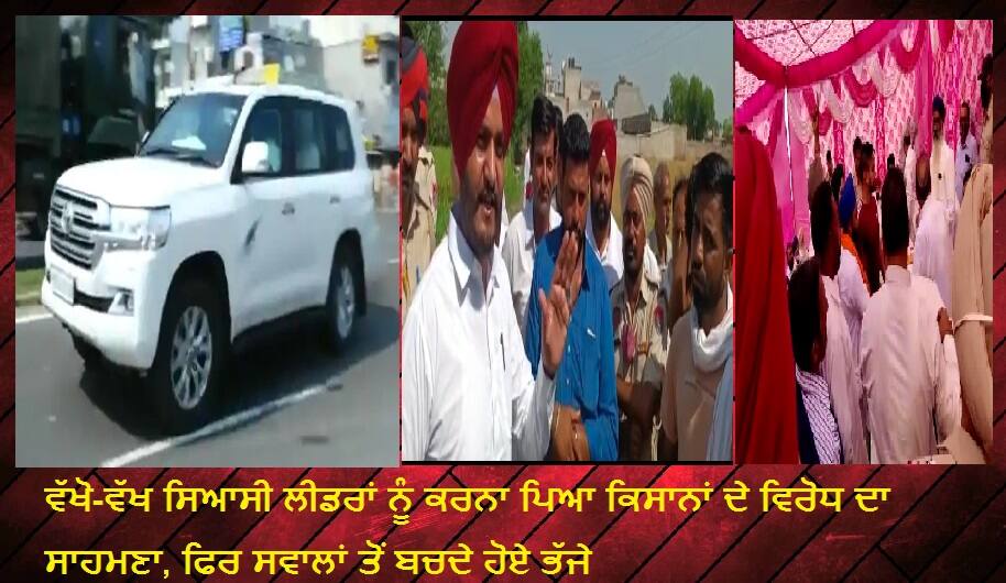 ਜਲੰਧਰ/ਨਵਾਂਸ਼ਹਿਰ/ਫਾਜ਼ਿਲਕਾ: ਖੇਤੀ ਸੁਧਾਰ ਕਾਨੂੰਨਾਂ ਦਾ ਵਿਰੋਧ ਕਰ ਰਹੇ ਕਿਸਾਨ ਪਿਛਲੇ ਕਈ ਮਹੀਨਿਆਂ ਤੋਂ ਲਗਾਤਾਰ ਸਿਆਸੀ ਪਾਰਟੀਆਂ ਦੇ ਆਗੂਆਂ ਦਾ ਘਿਰਾਓ ਕਰ ਰਹੇ ਹਨ। ਉਨ੍ਹਾਂ ਨੇ ਚੇਤਾਵਨੀ ਦਿੱਤੀ ਹੈ ਕਿ ਜਦੋਂ ਤੱਕ ਖੇਤੀਬਾੜੀ ਕਾਨੂੰਨ ਵਾਪਸ ਨਹੀਂ ਲਏ ਜਾਂਦੇ ਉਦੋਂ ਤੱਕ ਰੈਲੀਆਂ ਜਾਂ ਸਿਆਸੀ ਪ੍ਰੋਗਰਾਮ ਨਾ ਕੀਤੇ ਜਾਣ। ਬਾਵਜੂਦ ਇਸ ਦੇ ਸਿਆਸੀ ਲੀਡਰਾਂ ਵਲੋਂ ਪ੍ਰੋਗਰਾਮ ਕੀਤੇ ਜਾ ਰਹੇ ਹਨ। ਜਿਸ ਦੇ ਚਲਦਿਆਂ ਉਨ੍ਹਾਂ ਨੂੰ ਕਿਸਾਨਾਂ ਦੇ ਵਿਰੋਧ ਦਾ ਸਾਹਮਣਾ ਕਰਨਾ ਪੈ ਰਿਹਾ ਹੈ। ਅੱਜ ਵੀ ਵੱਖ-ਵੱਖ ਥਾਵਾਂ 'ਤੇ ਕਈ ਸਿਆਸੀ ਲੀਡਰਾਂ ਨੂੰ ਕਿਸਾਨਾਂ ਦੇ ਵਿਰੋਧ ਦਾ ਸਾਹਮਣਾ ਕਰਨਾ ਪਿਆ।