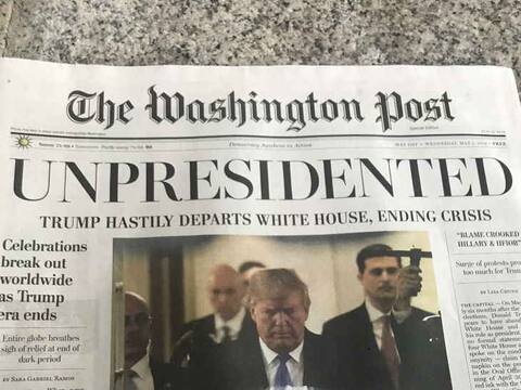 ਨਕਲੀ ਅਖ਼ਬਾਰ ਦੀ ਖ਼ਾਸ ਗੱਲ ਇਹ ਸੀ ਕਿ ਇਸ ਹਰ ਤਰ੍ਹਾਂ ਨਾਲ ਅਸਲੀ ਵਾਸ਼ਿੰਗਟਨ ਪੋਸਟ ਵਾਂਗ ਲੱਗ ਰਿਹਾ ਸੀ। ਇਸ ਦਾ ਡਿਜ਼ਾਈਨ ਤੇ ਸਾਈਜ਼ ਚੰਗੀ ਤਰ੍ਹਾਂ ਨਕਲ ਕੀਤਾ ਗਿਆ ਸੀ। 6 ਕਾਲਮਾਂ ’ਚ ਬਣੀ ਪਹਿਲੀ ਸੁਰਖ਼ੀ ਵਿੱਚ ਲਿਖਿਆ ਸੀ,‘ਅਨਪ੍ਰੈਜ਼ੀਡੈਂਟਿਡ’ ਯਾਨੀ ਰਾਸ਼ਟਰਪਤੀ ਅਹੁਦੇ ਤੋਂ ਹਟਣਾ। ਇਸ ਹੈਡਲਾਈਨ ਨਾਲ ਰਾਸ਼ਟਰਪਤੀ ਟਰੰਪ ਦੀ ਗੁੱਸੇ ਵਿੱਚ ਸਿਰ ਝੁਕਾਏ ਹੋਏ ਫੋਟੋ ਛਾਪੀ ਗਈ ਸੀ।