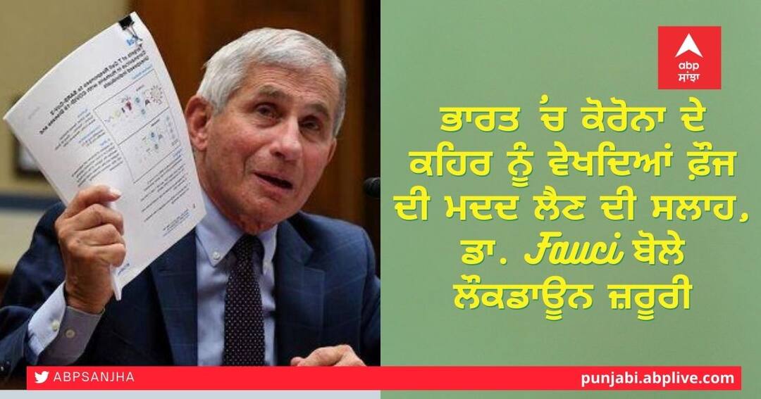ਵਾਸ਼ਿੰਗਟਨ: ਭਾਰਤ 'ਚ ਕੋਰੋਨਾ ਵਾਇਰਸ ਦੇ ਮਾਮਲਿਆਂ ਨੇ ਪੂਰੀ ਦੁਨੀਆਂ ਦੇ ਲੋਕਾਂ ਦੀ ਪ੍ਰੇਸ਼ਾਨੀ ਵਧਾ ਦਿੱਤੀ ਹੈ। ਇਸੇ ਸਿਲਸਿਲੇ 'ਚ ਅਮਰੀਕਾ ਦੇ ਸੀਨੀਅਰ ਜਨਤਕ ਸਿਹਤ ਮਾਹਰ ਤੇ ਵ੍ਹਾਈਟ ਹਾਊਸ ਦੇ ਮੁੱਖ ਮੈਡੀਕਲ ਸਲਾਹਕਾਰ ਡਾ. Fauci ਨੇ ਭਾਰਤ 'ਚ ਲਗਾਤਾਰ ਹੋ ਰਹੀਆਂ ਮੌਤਾਂ 'ਤੇ ਚਿੰਤਾ ਜ਼ਾਹਰ ਕੀਤੀ ਹੈ ਤੇ ਦੇਸ਼ ਪੱਧਰੀ ਲੌਕਡਾਊਨ ਦੀ ਮੰਗ ਕੀਤੀ ਹੈ। ਉਨ੍ਹਾਂ ਕਿਹਾ ਕਿ ਭਾਰਤ 'ਚ ਵੱਡੇ ਪੱਧਰ 'ਤੇ ਵੈਕਸੀਨ ਲਗਾਈ ਜਾਵੇ ਅਤੇ ਨਾਲ ਹੀ ਫ਼ੌਜ ਦੀ ਮਦਦ ਨਾਲ ਹਸਪਤਾਲ ਬਣਾਏ ਜਾਣ।